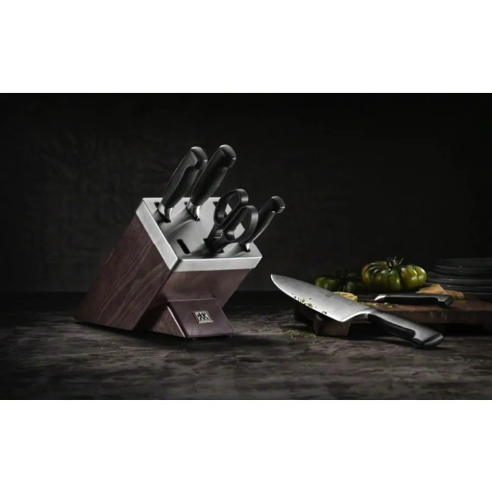 BEVAT: OFFICEMES 10 CM, UNIVERSEEL MES 13 CM, VLEESMES 20 CM, KOKSMES 20 CM, BROODMES 20 CM, TWIN L MULTIFUNCTIONELE SCHAAR IN EEN ZELFSLIJPEND ESSENHOUTEN MESSENBLOK