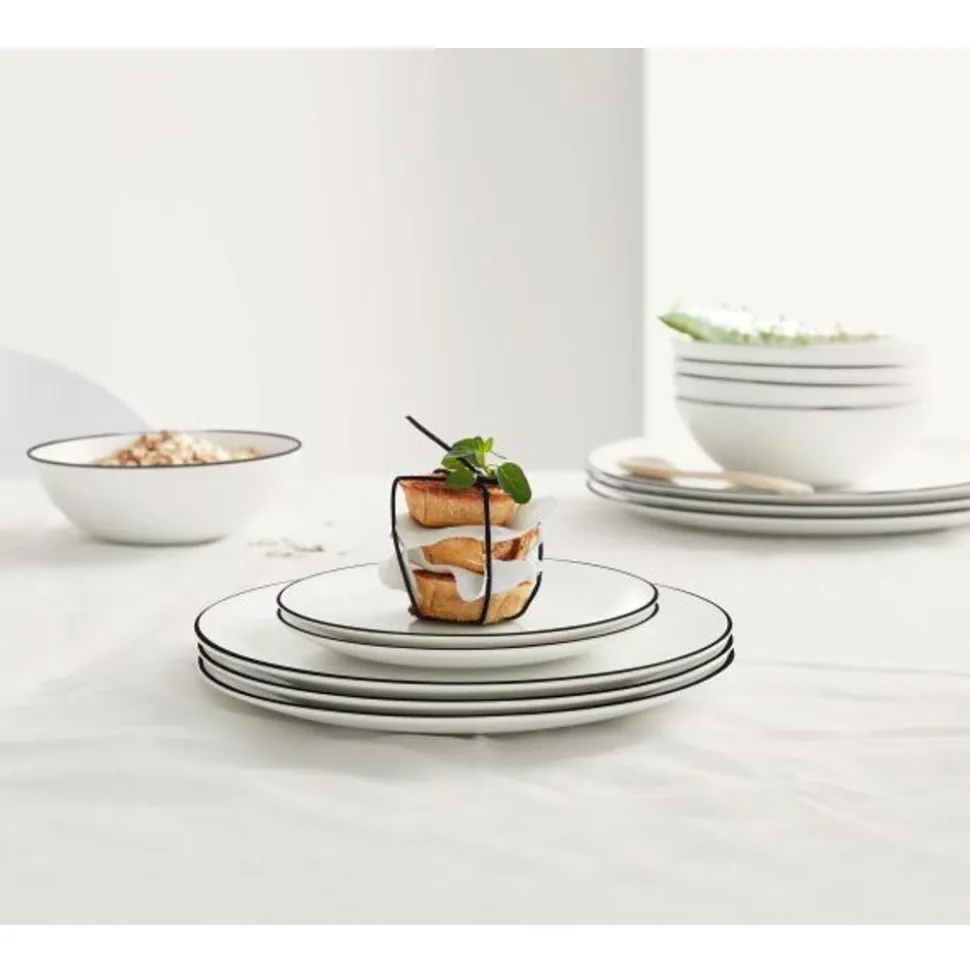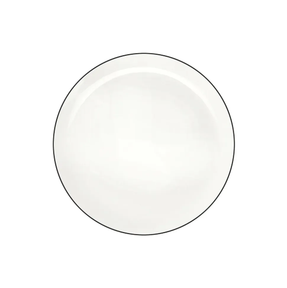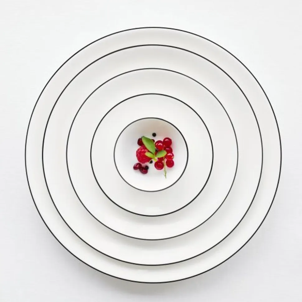 Een met een penseel aangebrachte handgeschilderde zwarte lijn siert de omvangrijke serviesserie “à table ligne noire” en vormt een extravagante afwerking van dit servies. De serie is ontworpen voor elke gelegenheid: hij overtuigt door zijn extreme hardheid, warm wit, helder design, pure elegantie en enorme verscheidenheid aan vormen voor een perfect gedekte tafel. De extreme randsterkte en stapelbaarheid maken de schalen ook geschikt voor gebruik in de horeca. Te combineren met “à table”, zonder zwarte randversiering.