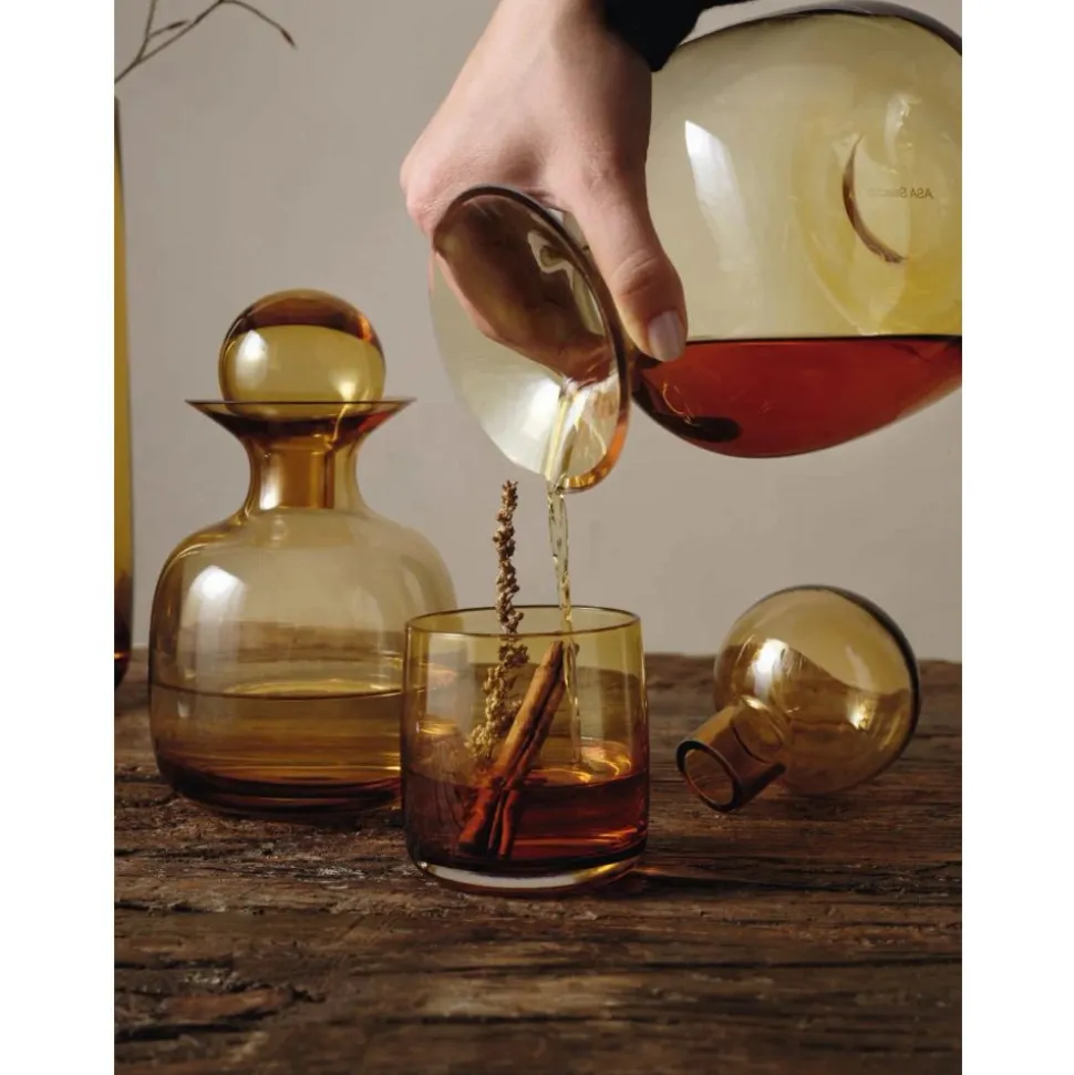 De mondgeblazen glascollectie van ASA Selection met design, plezier en functie. Of het nu gaat om trendy longdrinks met gin of alcoholvrije versnaperingen zoals spritzers en limonades: het glas met een inhoud van 0,4 liter ligt net als de kleinere tumbler heerlijk in de hand dankzij de versterkte bodem en licht bolvormige vorm. Net als deze glazen is de karaf, die verkrijgbaar is in twee plezierige maten, een zintuiglijk en design hoogtepunt in de huisbar. Met slechts een vleugje kleur hebben twee decors in de glasserie elk hun eigen sterke persoonlijkheid: de glinsterende amberkleurige “Amber” glazen symboliseren gezellige warmte. De karaffen worden aangeboden in een geschenkverpakking.