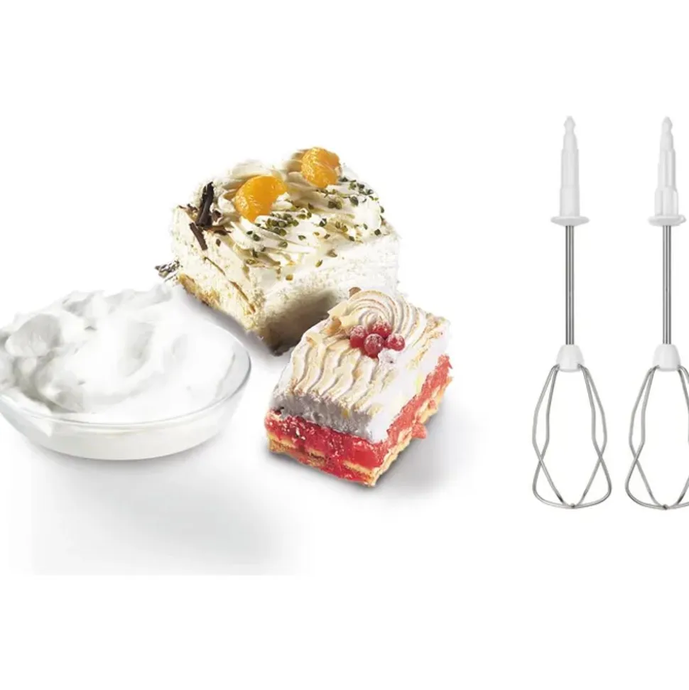 Handmixer ErgoMixx. Met inox mixervoet, 2 turbo-kloppers, 2 kneedhaken en mixerbeker met deksel. 450 Watt. Innovatieve motortechniek: krachtig, stil en licht. Momentschakelaar. Afzonderlijke uitwerptoets voor kloppers en kneedhaken. Mixerbeker voorzien van schaalverdeling en van deksel. Optimale “soft-touch” handgreep met grote knoppen en ergonomische vorm. Aansluitmogelijkheid voor staafmixervoet. Mixervoet eenvoudig verwijderbaar. Hoogwaardige inox mixervoet.