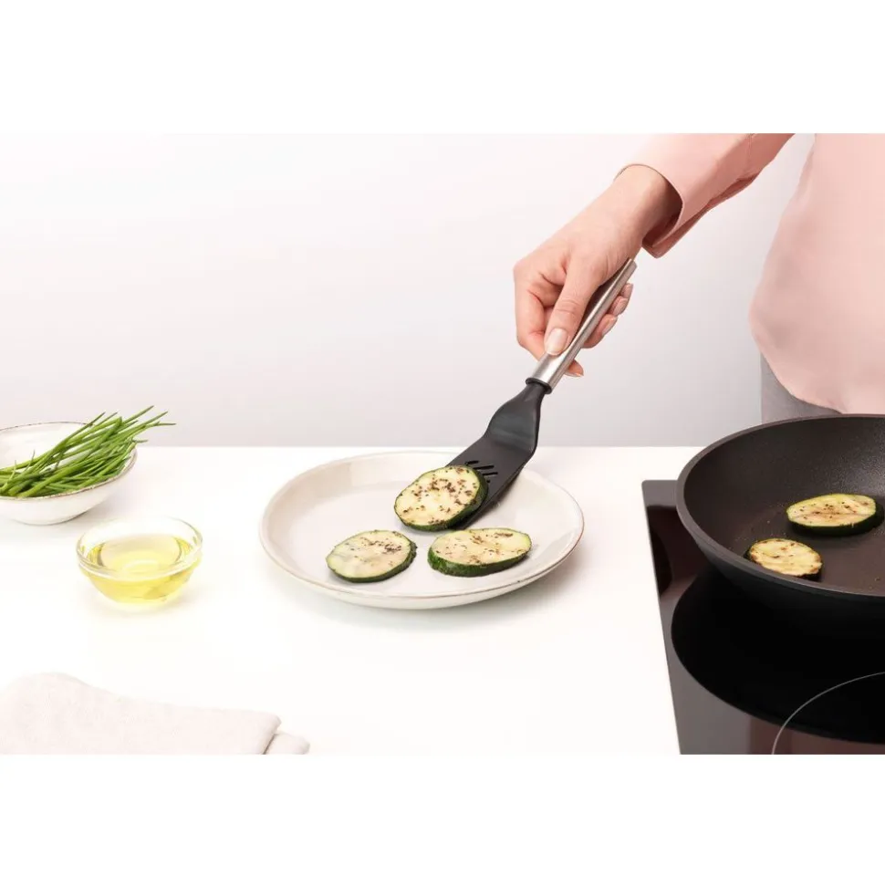 Overtollig braadvet hoort niet bij een lekkere maaltijd. Deze spatel is zo gemaakt dat het teveel aan vet door de sleuven weg kan.