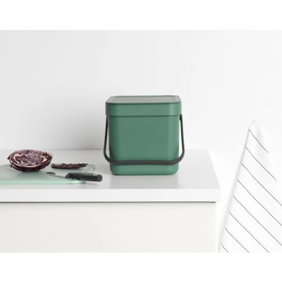 Dit leuke Brabantia Sort & Go afvalemmertje van 6 liter met openblijvend deksel is super voor schillen, korstjes, kliekjes … eigenlijk voor al je organische keukenafval. Zet hem op je aanrecht, verstop hem in een la of hang ‘m aan de muur met de bijgeleverde muurbeugel. Vol? Grijp het handige hengsel en leeg hem. Oh, en wil je er afvalzakken bij? De PerfectFit 100% composteerbare zakken, maat S, passen perfect. XS formaat, XL gemak.