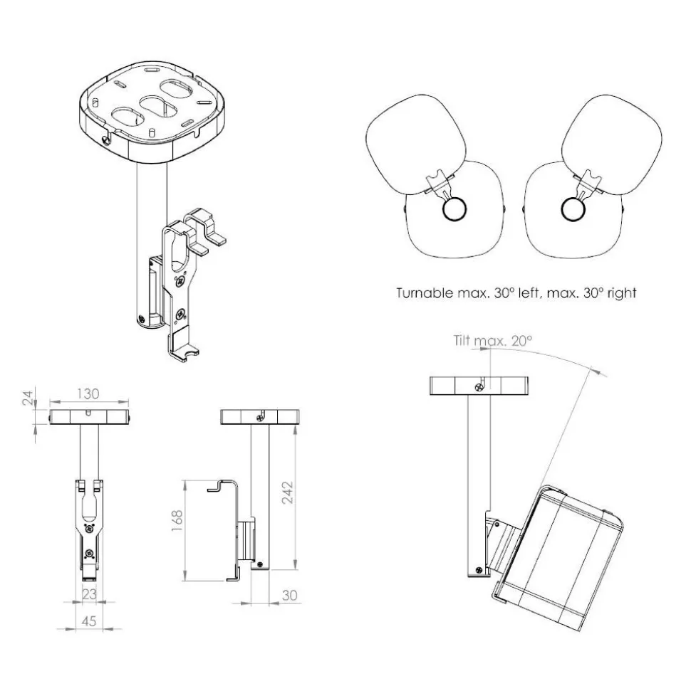 Met de meegeleverde montagematerialen heb je alles in huis om de plafondbeugel snel en eenvoudig te bevestigen. Je kunt de ophangbeugel over een plafond-centraaldoos bevestigen. Vergelijkbaar zoals je een lamp zou ophangen.