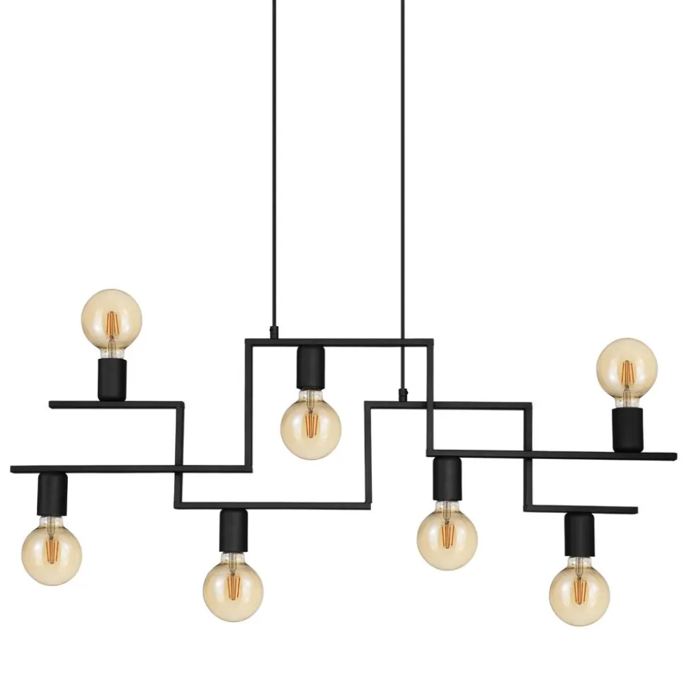 De FEMBARD-vering bestaat uit twee zwarte metalen staven die ten opzichte van elkaar verspringen. Dankzij de verschillende oriƫntaties van de armen worden de zeven zichtbare houders op verschillende hoogten en posities geplaatst. Dit geeft het armatuur een originele toets en maakt het tot een van de middelpunten van de ruimte waarin het wordt geplaatst, of dat nu in de woonkamer is of in de eetkamer, bijvoorbeeld boven een lange tafel. De hanger kan worden gecombineerd met bijna elke interieurtrend. De afgebeelde lichtbronnen zijn niet inbegrepen. De armatuur is compatibel met elke E27 lamp.