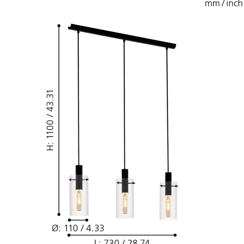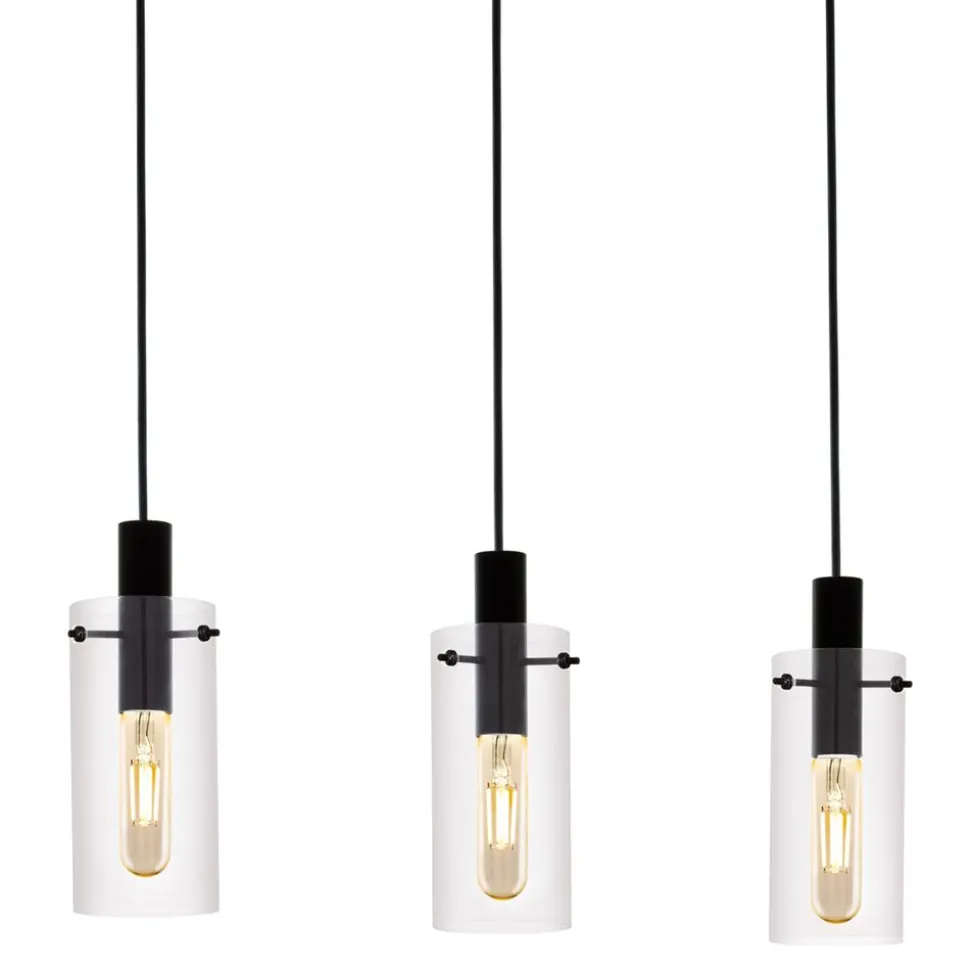 De hanglamp MONTEFINO bestaat uit drie transparante glazen cilinders die aan zwarte metalen houders hangen. De transparante glazen kappen geven direct zicht op de lampen binnenin. De armatuur hangt aan een rechthoekige zwarte metalen kap. Deze hanger geeft de finishing touch aan een modern interieur en zorgt voor stijlvolle verlichting in de woonkamer of eetkamer. De afgebeelde lichtbronnen zijn niet inbegrepen. De armatuur is compatibel met langwerpige E27 lichtbronnen.