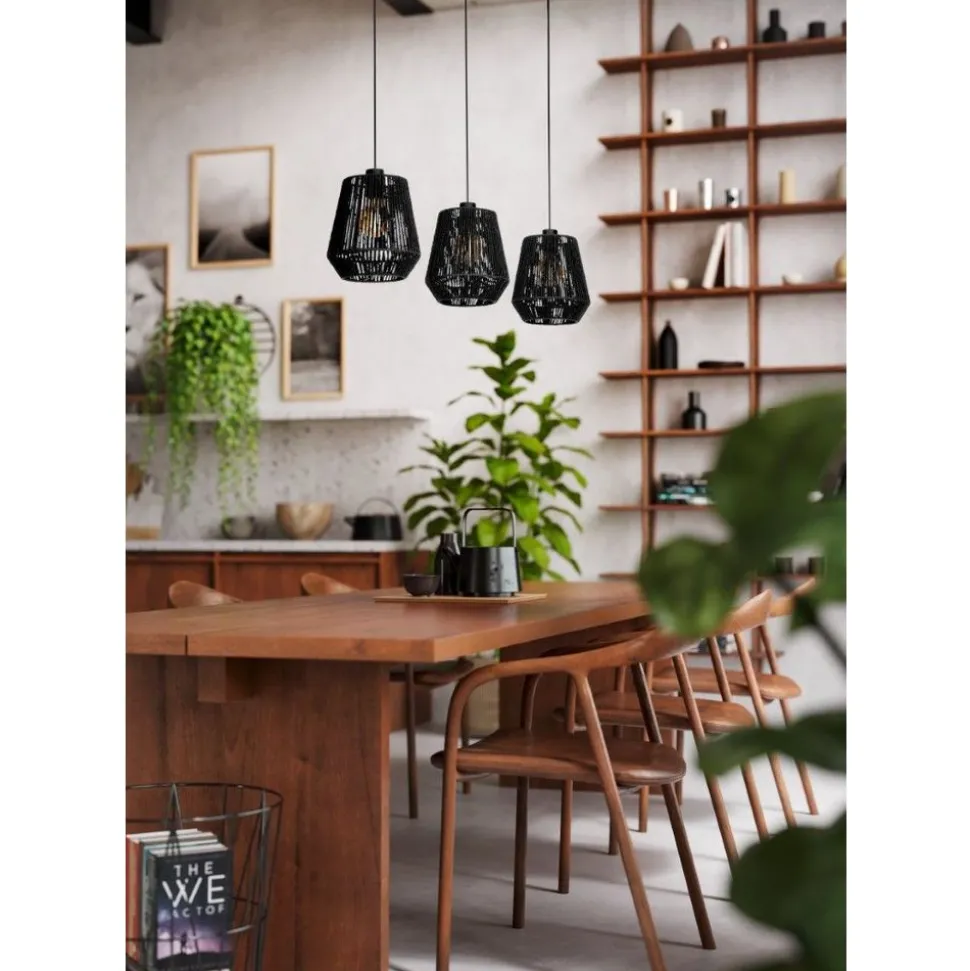 De PERSLEY hanglamp van zwart staal en 3 unieke geweven, papieren kappen in het zwart, is dé moderne touch voor in huis. Deze hanglamp staat zowel goed boven een eettafel of een keukeneiland in een moderne woning. Deze hanglamp gebruik 3 E27 lampen, met een warme lichtbron (niet inbegrepen) maak je een heel gezellige sfeer.