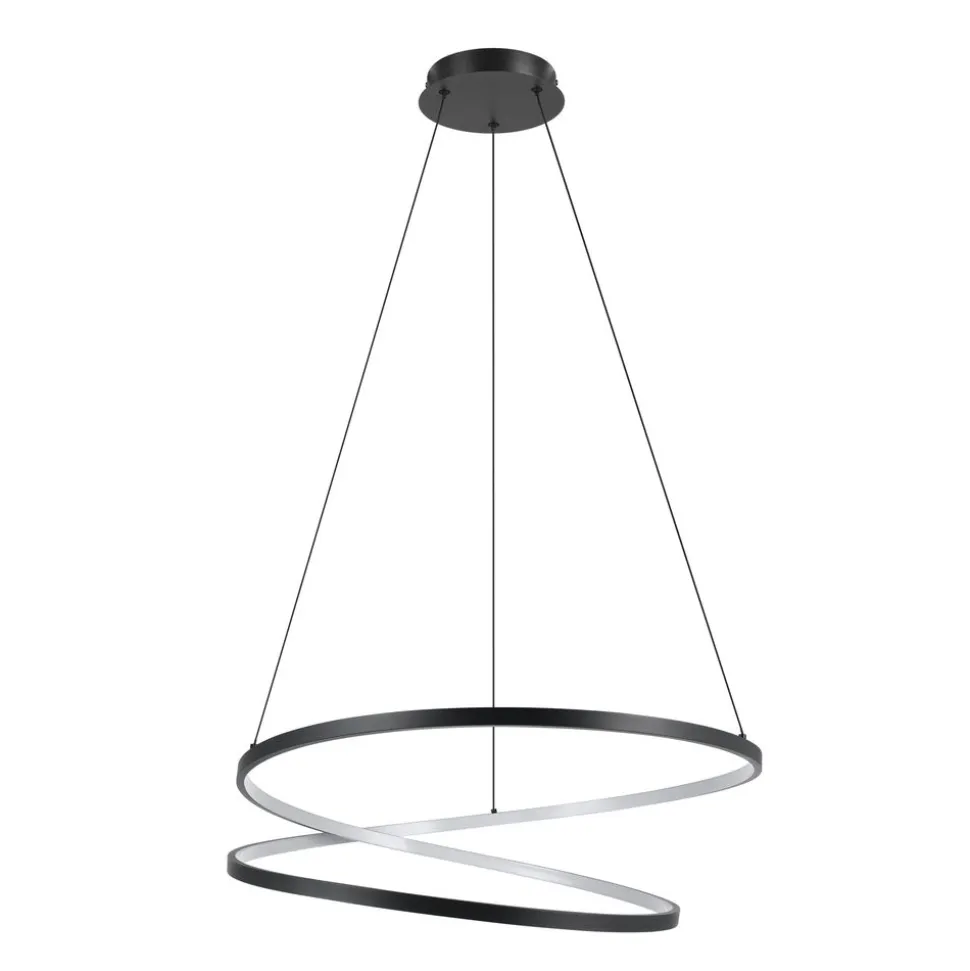 De RUOTALE LED hanglamp bestaat uit een harmonische ronde LED-balk van zwart metaal met een wit kunststof verlichtingsoppervlak aan de binnenkant. De staaf is door middel van drie metalen kabels opgehangen aan een ronde zwarte metalen kap. De geïntegreerde LEDs stralen een indirect warm wit licht uit. De ophanging past perfect in moderne interieurs en is een blikvanger in de woonkamer of eetkamer boven de tafel.