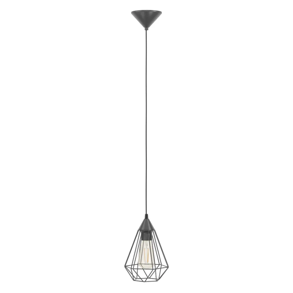 De TARBES hanglamp bestaat uit een zwarte draadkap in de vorm van een diamant, opgehangen aan een ronde kap van dezelfde kleur. Wanneer de geometrische kap wordt verlicht, creëert hij een fascinerend spel van licht en schaduw. Deze moderne hanglamp zorgt voor stijlvolle verlichting in elke kamer, of het nu de woonkamer, slaapkamer of eetkamer is. De afgebeelde lichtbron is niet inbegrepen. Het armatuur is compatibel met elke E27 lamp.