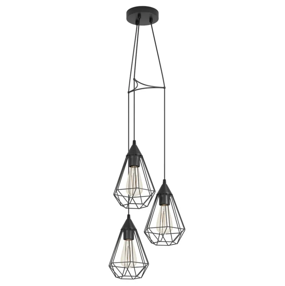 De TARBES hanglamp bestaat uit drie zwarte, ruitvormige draadkappen die op verschillende hoogten aan een ronde kap van dezelfde kleur hangen. Wanneer de geometrische tinten worden verlicht, creëren ze een fascinerend spel van licht en schaduw. Deze moderne hanglamp zorgt voor stijlvolle verlichting in elke kamer, of het nu de woonkamer of de eetkamer is. De afgebeelde lichtbronnen zijn niet inbegrepen. De armatuur is compatibel met elke E27 lamp.
