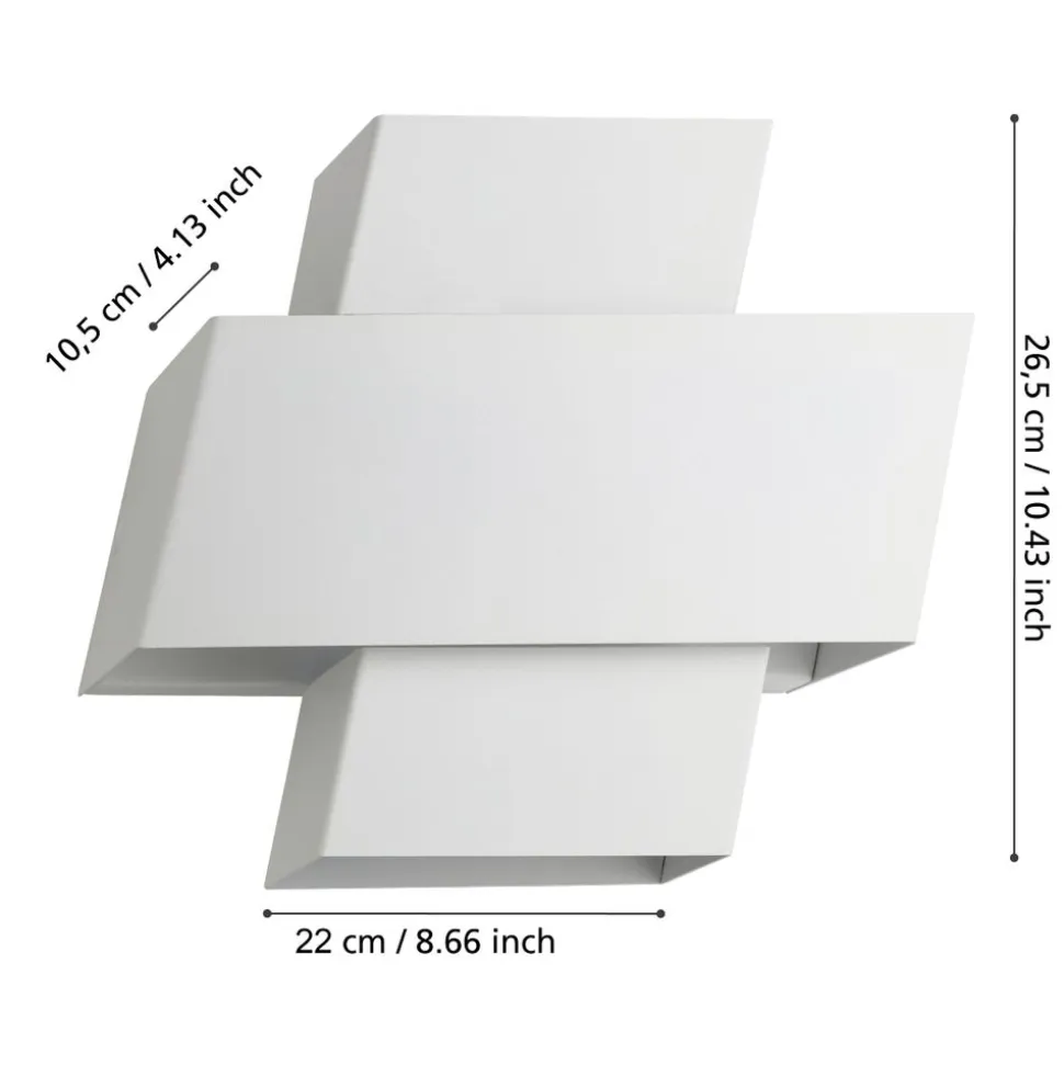 De TIMPAROSSA wandlamp bestaat uit een wit metalen lichaam dat bestaat uit drie parallellepipeda die in een hoek met elkaar verbonden zijn. De openingen boven en onder de lamp zorgen voor een comfortabele, indirecte verlichting naar boven en beneden op de muur. De wandlamp past perfect in minimalistische interieurs en biedt moderne verlichting voor elke ruimte – of het nu in de keuken, woonkamer, slaapkamer, hal of eetkamer is. De afgebeelde lamp wordt niet meegeleverd. Het armatuur is geschikt voor alle lichtbronnen met E27 voet.