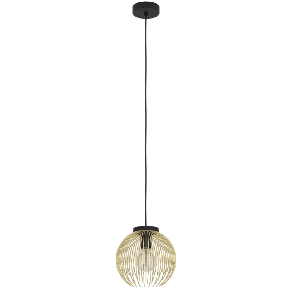 De hanglamp VENEZUELA bestaat uit een gouden draadkap die met een zwarte textielkabel aan een ronde kap van zwart metaal is opgehangen. De draadkap omhult de lamp binnenin met haar harmonieuze rondheid, waardoor een fascinerend spel van licht en schaduw ontstaat zodra het armatuur wordt ingeschakeld. Deze hanglamp geeft de finishing touch aan een modern interieur en zorgt voor stijlvolle verlichting in de woonkamer of in de eetkamer boven de tafel. De afgebeelde lichtbron is niet inbegrepen. De lamp is compatibel met elke E27 lamp.