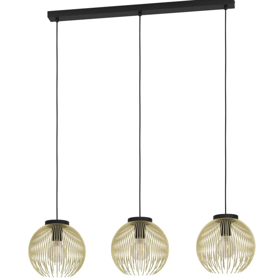 De hanglamp VENEZUELA bestaat uit drie gouden draadkappen die met zwarte textielkabels aan een ronde zwarte metalen kap zijn opgehangen. De draadkappen omsluiten met hun harmonieuze rondheid de lampen die zich in elk van hen bevinden, waardoor een fascinerend spel van licht en schaduw ontstaat zodra het armatuur wordt ingeschakeld. Deze hanglamp geeft de finishing touch aan een modern interieur en zorgt voor stijlvolle verlichting in de woonkamer of in de eetkamer boven de tafel. De afgebeelde lichtbronnen zijn niet inbegrepen. De lamp is compatibel met elke E27 lamp.