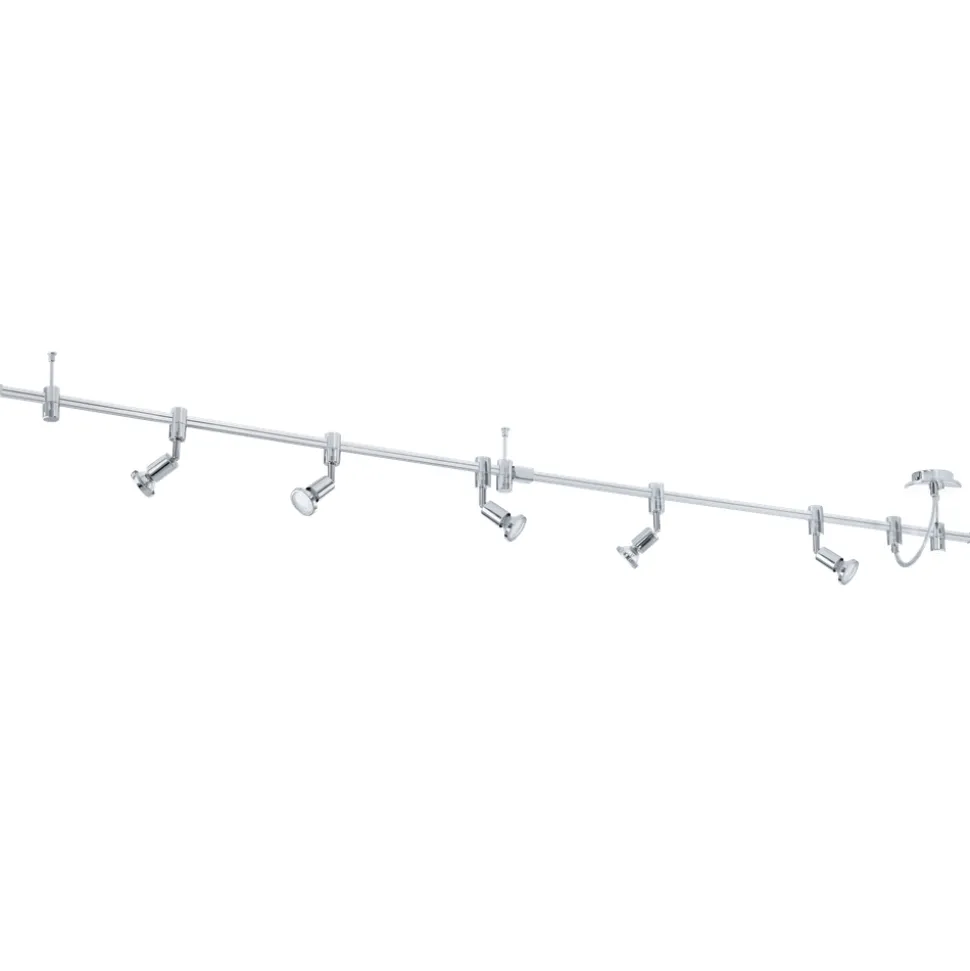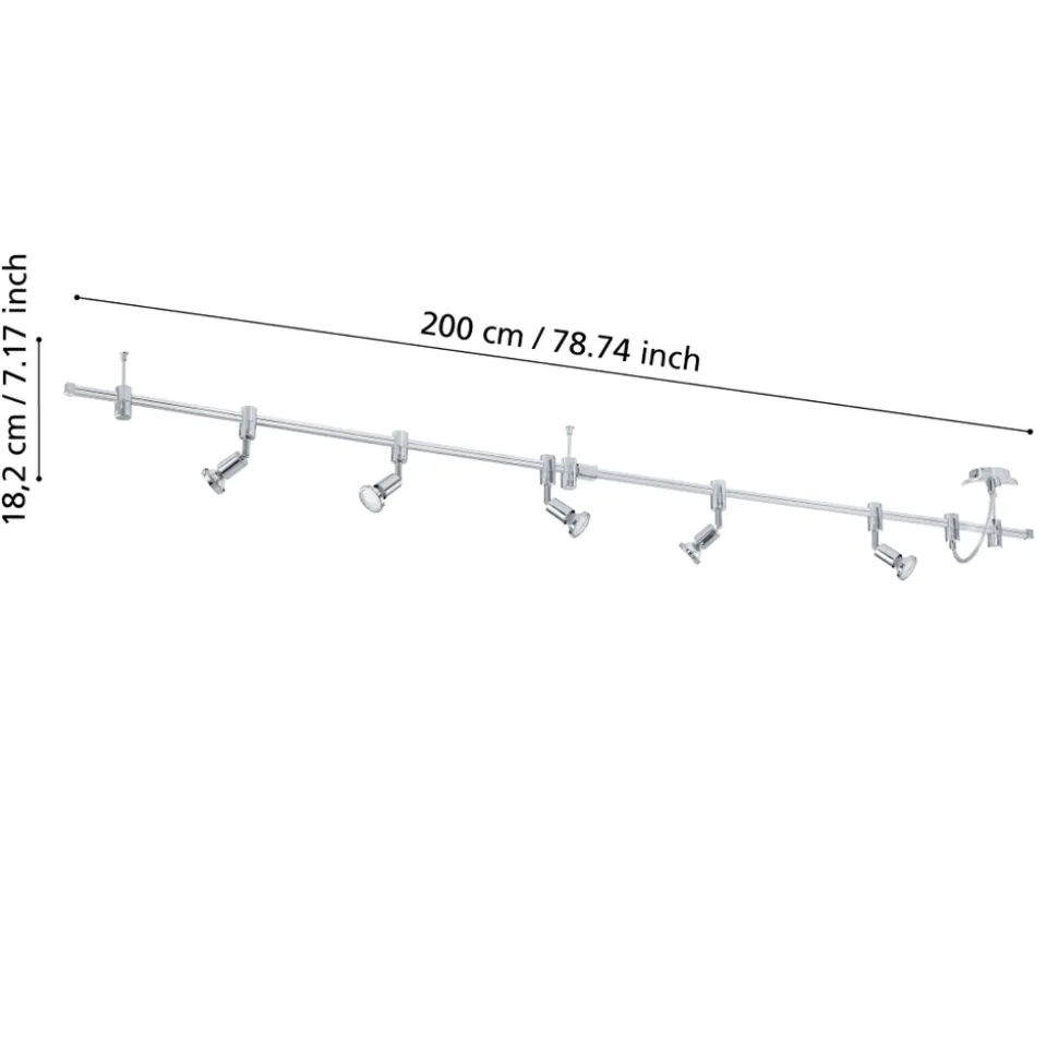De LED-plafondlamp VILANOVA bestaat uit een aluminium rail die door drie steunen aan het plafond wordt bevestigd. De armatuur is gecombineerd met vijf verplaatsbare verchroomde metalen spots die flexibel op de rail kunnen worden geplaatst. Deze tijdloze plafondlamp geeft de finishing touch aan een modern interieur en zorgt voor gerichte verlichting, of het nu in de keuken, woonkamer, slaapkamer, eetkamer of hal is. De afgebeelde GU10 lampen zijn inbegrepen en geven een aangenaam warm wit licht.
