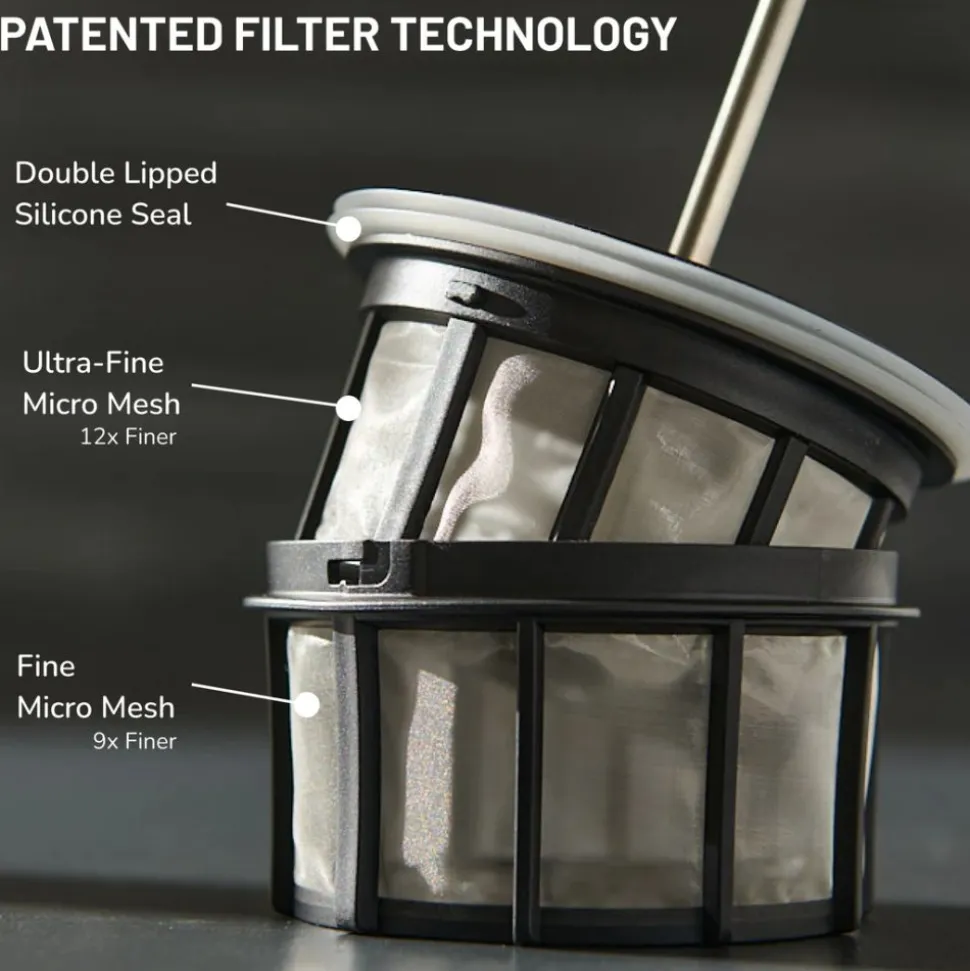Gepatenteerde dubbele microfilters zeven de gemalen koffie door filters die 9 tot 12 keer fijner zijn dan die van een gewone French press. Zo wordt voorkomen dat er gruis in uw koffie terechtkomt.