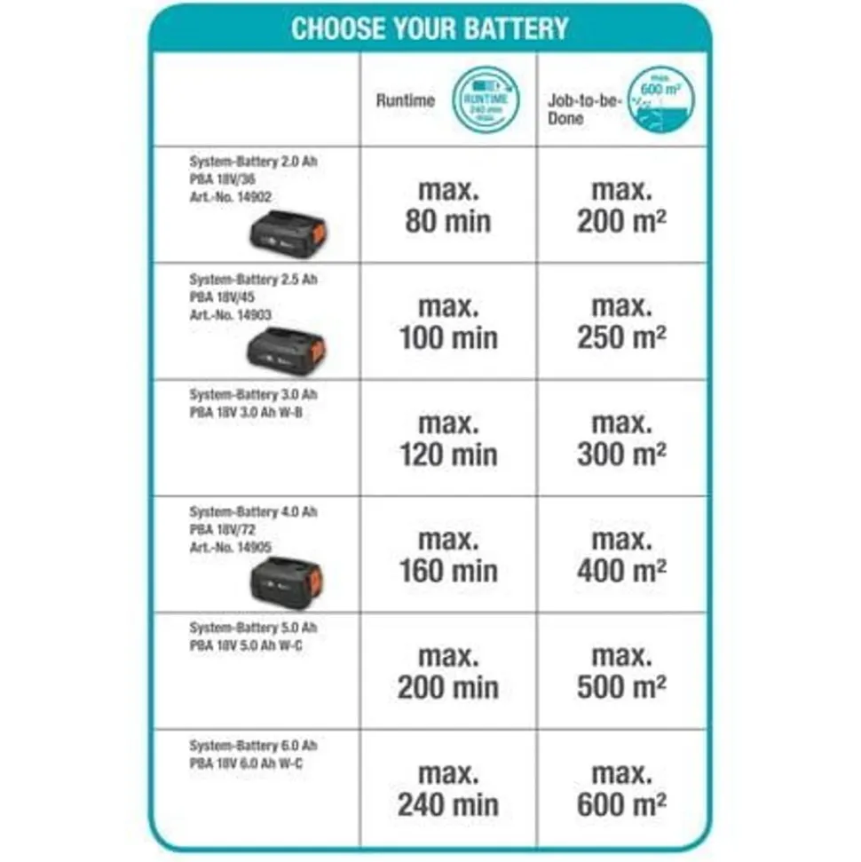 Dankzij een led-indicator direct op het handvat ben je altijd op de hoogte van het actuele laadniveau. Deze tool is compatibel met alle accu’s van de 18V FOR ALL ALLIANCE. Afhankelijk van de gebruikte batterij kan het product een batterijduur van maximaal 240 minuten bereiken en tot 600 vierkante meter heg snoeien.
