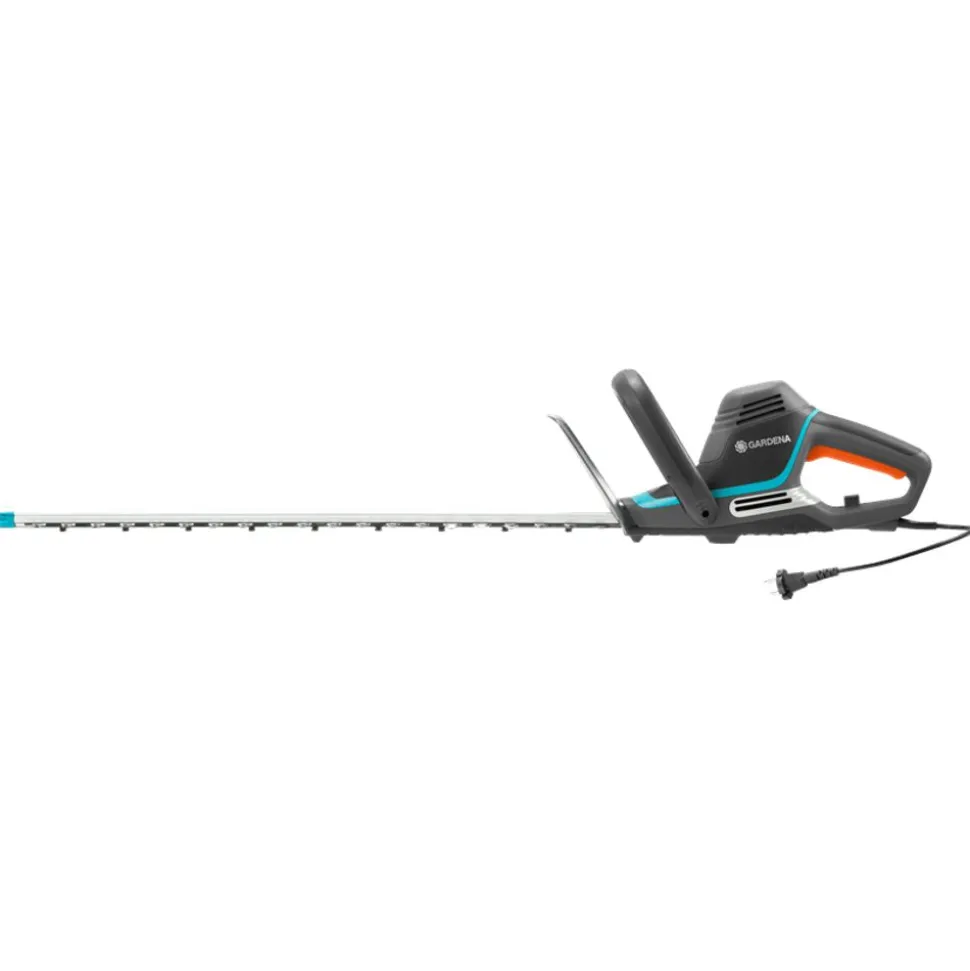 GARDENA’s powerful and high-performance Electric Hedge Trimmer PowerCut 700/65 helps you prune large hedges effortlessly. The hedge trimmer has a well-balanced design so that you can guide it optimally even when using it for longer periods. It fits comfortably in your hand in any cutting position, thanks to the ergonomic ErgoLine handle. This is particularly helpful when cutting the side hedge sections. The start button in the handle makes operation intuitive and the laser-cut precision blades enable you to cut quickly and easily with little effort. With these helpful design features you achieve an efficient, clean cut of twigs and branches. Thanks to the ProZone with professional grinding and special teeth you can even cut tough branches with ease. The blade end of the PowerCut 700/65 is fitted with an impact protection that protects the blades during operation near the ground or along house or garden walls. The cable strain relief prevents unintentional loosening of the cable.