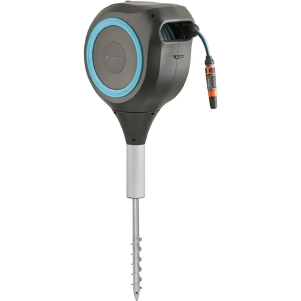 De slangenbox RollUp M van GARDENA biedt niet alleen een veilige en ruimtebesparende opslag voor uw tuinslang, maar u zult ook blij zijn met de moeiteloze bewatering van uw middelgrote tuin. De handige slangenbox wordt in de grond verankerd met een stevige standaard op een plek naar keuze in een bloembed of op het gazon. Met behulp van een bevestigingsstang kunt u de metalen pen nog eenvoudiger in de grond schroeven. Voor gebruik trekt u de 20 meter lange slang uit tot de gewenste lengte en kunt u meteen beginnen met bewateren. Dankzij de ingebouwde korte vergrendelingspunten is het hanteren van de tuinslang eenvoudiger dan ooit: zodra u stopt met de slang, wordt de vergrendeling automatisch vastgezet op de gewenste slanglengte. Het innovatieve ontwerp kan 360 graden worden gedraaid, voor maximale flexibiliteit bij het bewateren van de tuin. De box volgt altijd uw bewegingen, zodat u elke hoek van uw tuin gemakkelijk kunt bereiken zonder dat de tuinslang knikt of in de knoop raakt. Bovendien bespaart u met deze slangenbox vermoeiend opwikkelen en oprollen en hebt u geen last van vuile handen: door kort aan het uiteinde van de slang te trekken, wordt de vergrendeling ontgrendeld en wordt de tuinslang dankzij een geïntegreerde stalen veer volledig automatisch en betrouwbaar opgerold. De box heeft een praktische slanggeleider die de slang op zijn plaats houdt, zodat er geen blokkades of knopen optreden. De innovatieve RollControl-technologie zorgt voor veilig, gecontroleerd en moeiteloos oprollen zonder dat de slang in de war raakt. Het hoogwaardige materiaal is bestand tegen UV en vorst, heeft een lange levensduur en is onderhoudsvrij. De box is zeer compact en stijlvol ontworpen, zodat deze eenvoudig in elke tuin kan worden geïntegreerd. Hij is bovendien afgesteld op de hoogte van de GARDENA robotmaaiers, zodat het gazon rond de slangenbox altijd wordt onderhouden en gemaaid. De slangenbox wordt geleverd met een flexibele aansluitslang, alle benodigde montageonderdelen, de Original GARDENA System elementen en een sproeier met twee verschillende sproeipatronen. GARDENA geeft vijf jaar garantie op de slangenbox RollUp M. Bewatering die altijd gebruiksklaar is.