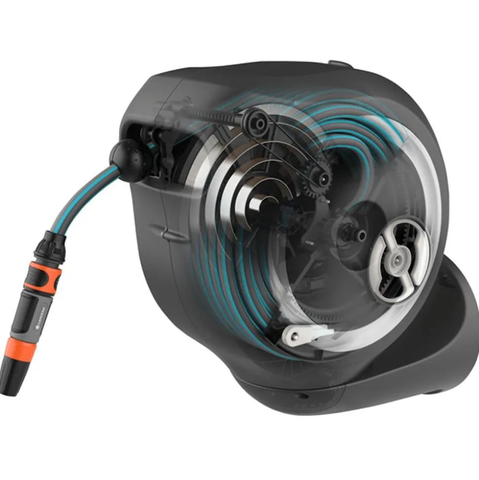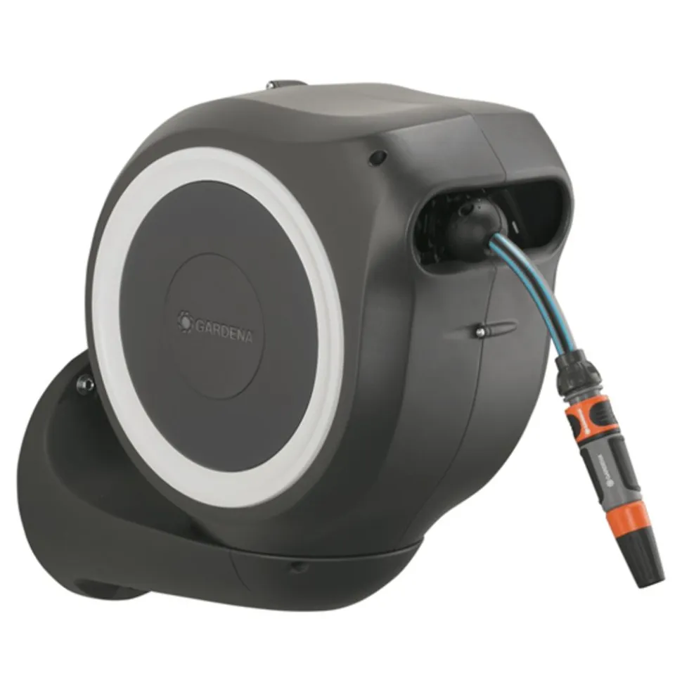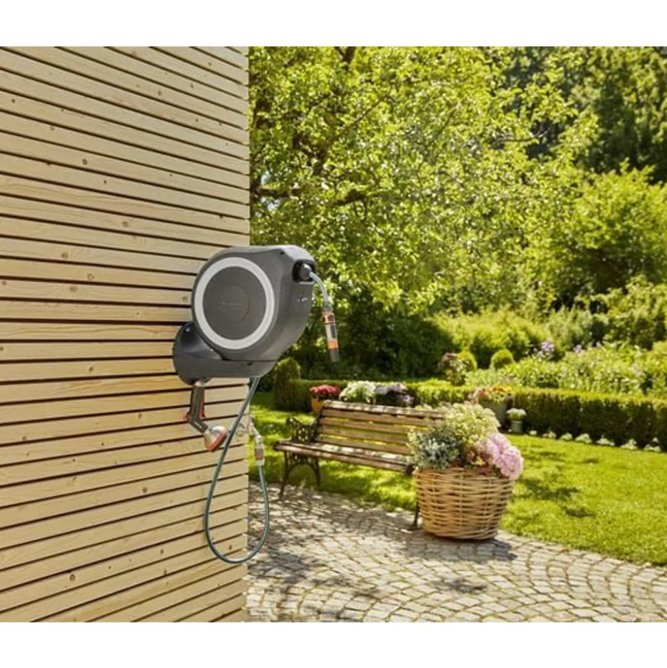 Tuinieren is handiger en gemakkelijker dan ooit met de wandslangenbox RollUp S. Deze helpt uw tuin netjes en opgeruimd te houden en voorkomt hinderlijk struikelgevaar als gevolg van een rondslingerende slang. De praktische slangopslag is eenvoudig aan de muur van uw huis te bevestigen en wordt met een flexibele aansluitslang aangesloten op de kraan. Dankzij de stevige muurbeugel kan de slangenbox meer dan 180 graden worden gedraaid, zodat u elke hoek van uw tuin moeiteloos kunt bereiken. Voor direct gebruik kunt u de tuinslang eenvoudig verlengen tot een lengte van maximaal 15 meter. De tuinslang wordt automatisch in heel korte intervallen vergrendeld zodra u stopt, wat betekent dat de slang eenvoudig en gemakkelijk te hanteren is. Door lichtjes aan het uiteinde van de slang te trekken, wordt de vergrendeling ontgrendeld en een ingebouwde stalen veer met innovatieve RollControl-technologie zorgt voor soepel en gecontroleerd oprollen. De RollControl beschermt de slangenbox en de omgeving tegen schade als gevolg van het te snel inrollen. Om knikken of knopen in de slang te voorkomen, heeft de box een geïntegreerde slanggeleider. Dankzij de slang- en kraanaansluitingen van het Original GARDENA System kunt u eenvoudig en flexibel een verlengstuk of ander compatibel GARDENA element op de slang aansluiten. U hebt altijd uw GARDENA slangopzetstukken bij de hand. Ze kunnen onder de muurbeugel worden bevestigd en daar worden opgeborgen om ruimte te besparen. De GARDENA wandslangenbox is UV- en vorstbestendig en kan het hele jaar door probleemloos aan de muur van het huis blijven bevestigd. Het hoogwaardige materiaal biedt u een lange levensduur en gebruiksgemak zonder onderhoud. Samen met de wandslangenbox ontvangt u een muurbeugel, een flexibele aansluitslang, alle benodigde Original GARDENA System en montageonderdelen en een mondstuk met twee verschillende sproeiopties. Dit hoogwaardige product wordt geleverd met een garantie van vijf jaar van GARDENA. Bewatering die altijd gebruiksklaar is , dankzij de GARDENA wandslangenbox RollUp S.