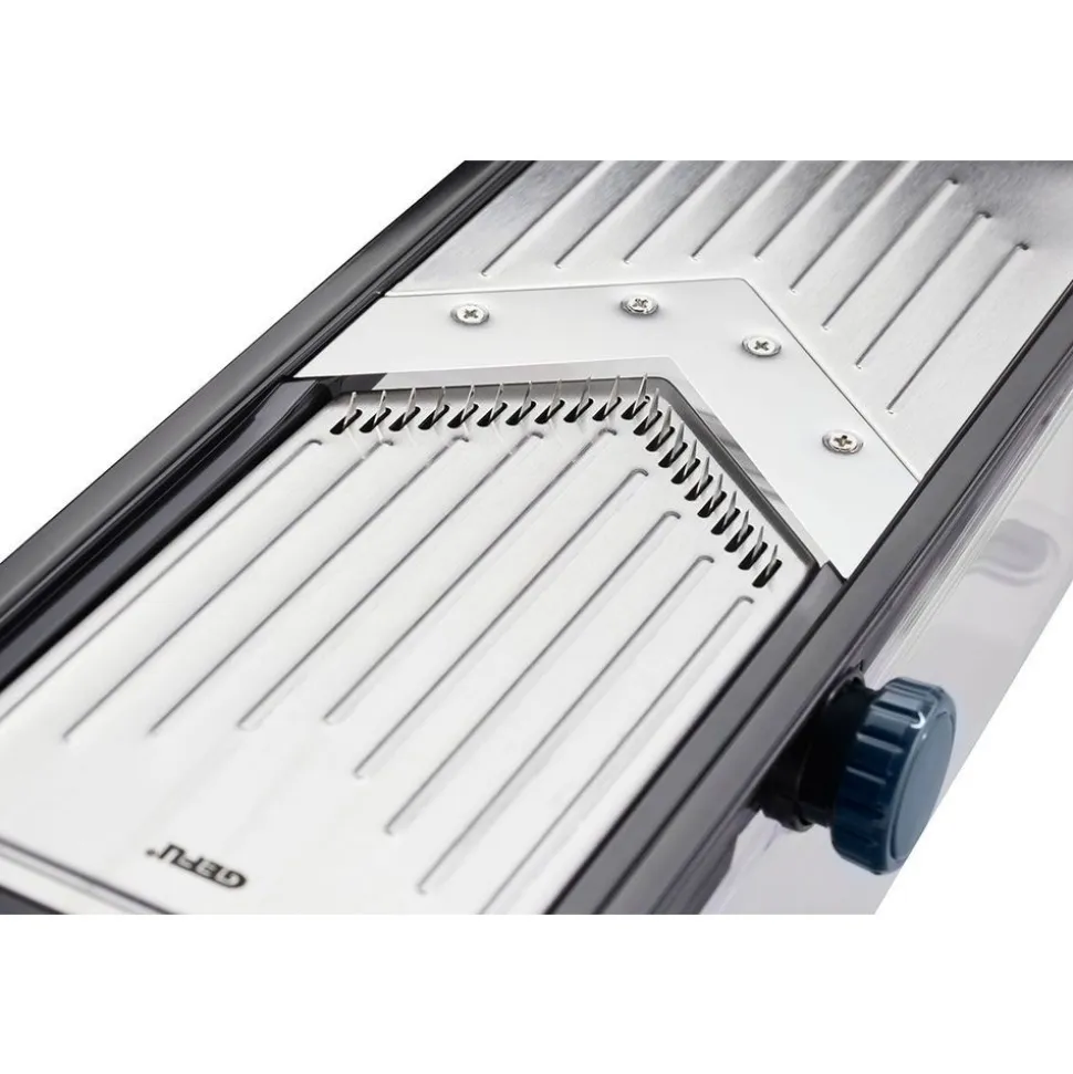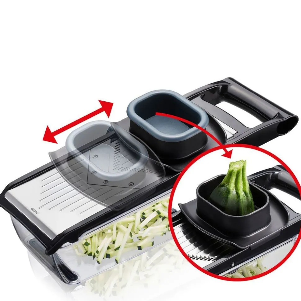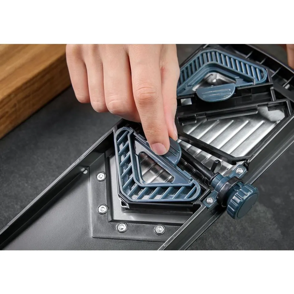 - veelzijdig: 5 instelbare snijdiktes van 1-5 mm en twee mesopzetstukken voor juliennereepjes van 3-6 mm breed