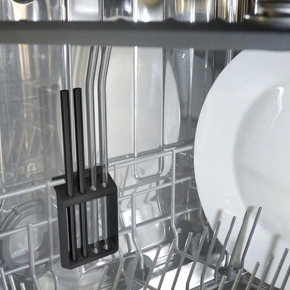 Nu kun je zo vaak als je wilt genieten van versgeperste sappen, smoothies enz., zonder dat je plezier erdoor wordt verstoord: deze hangmand met praktische clip is een veilige plek om zowel stalen als glazen rietjes in de vaatwasser op te bergen.