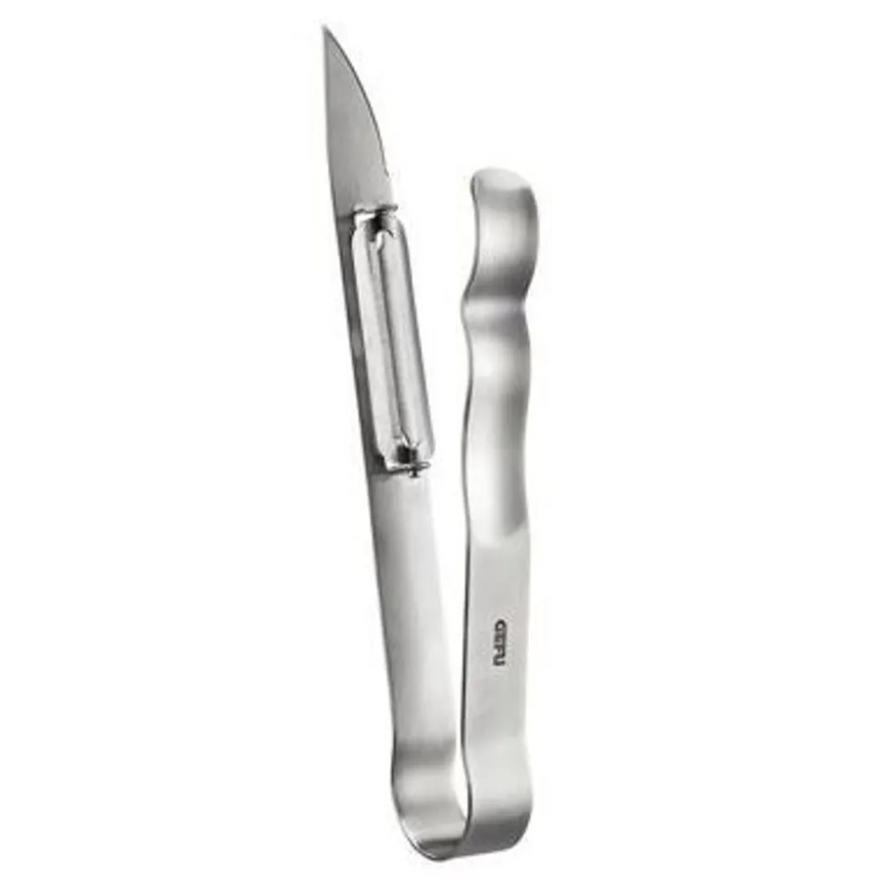 Het gebogen ontwerp ziet er niet alleen stijlvol uit, het zorgt er ook voor dat asperges en wortels goed dichtgeschroeid worden. Het ingebouwde mes snijdt in één keer de uiteinden van asperges of wortels.