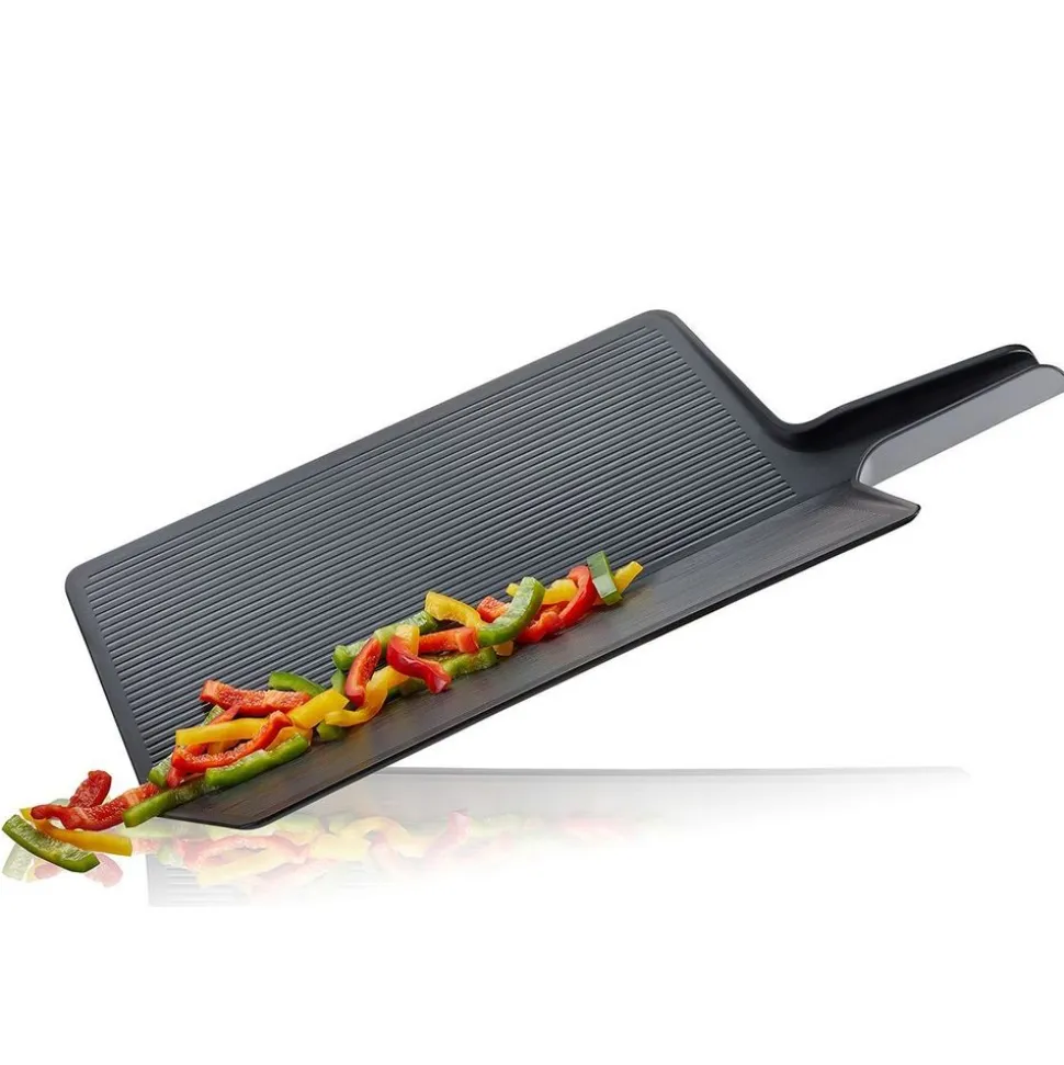 Eenvoudiger kan niet: eerst worden het fruit, de groenten, de vis, het vlees etc. op de mesvriendelijke snijplank van hoogwaardig kunststof gesneden en vervolgens gemakkelijk en zonder morsen in het gewenste kookgerei of de gewenste kom gegoten. Dit wordt zowel verzekerd door de soft-touch handgreep als door de praktische mogelijkheid om het midden van het snijoppervlak te buigen. De antislipribbels aan de onderkant van dit zwarte keukenhulpje zorgen voor extra veiligheid.