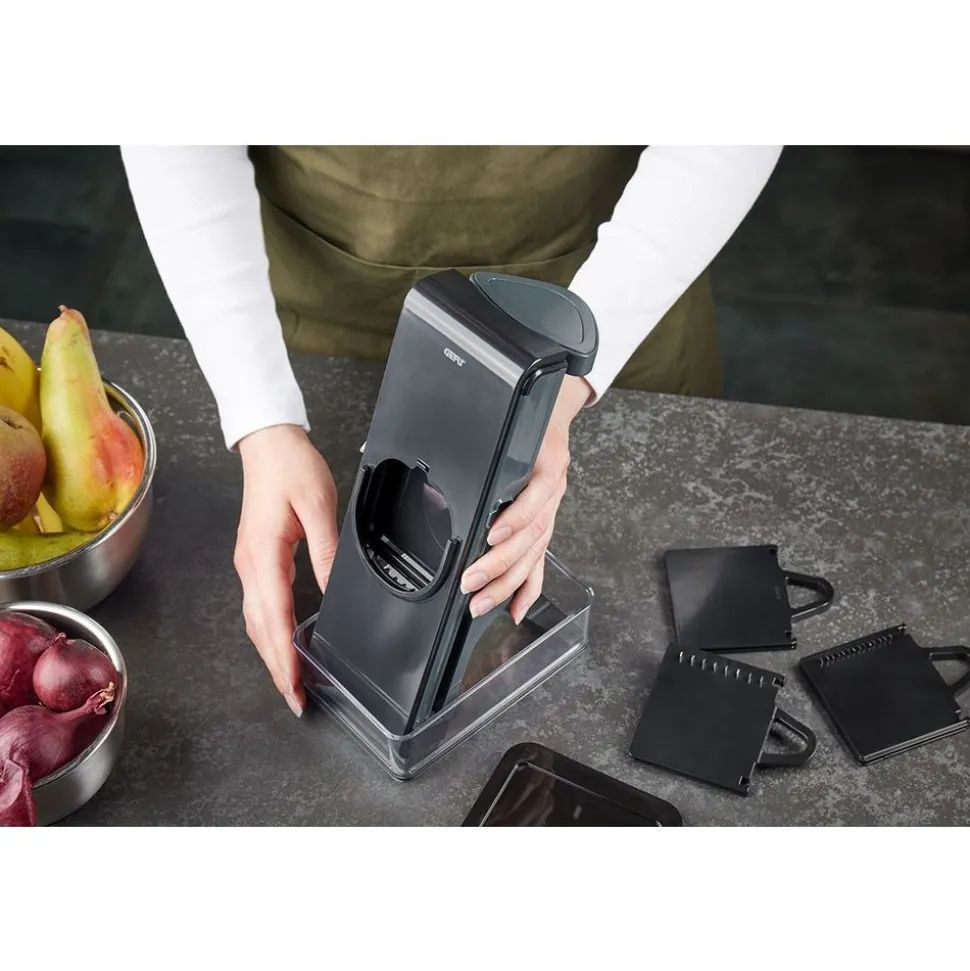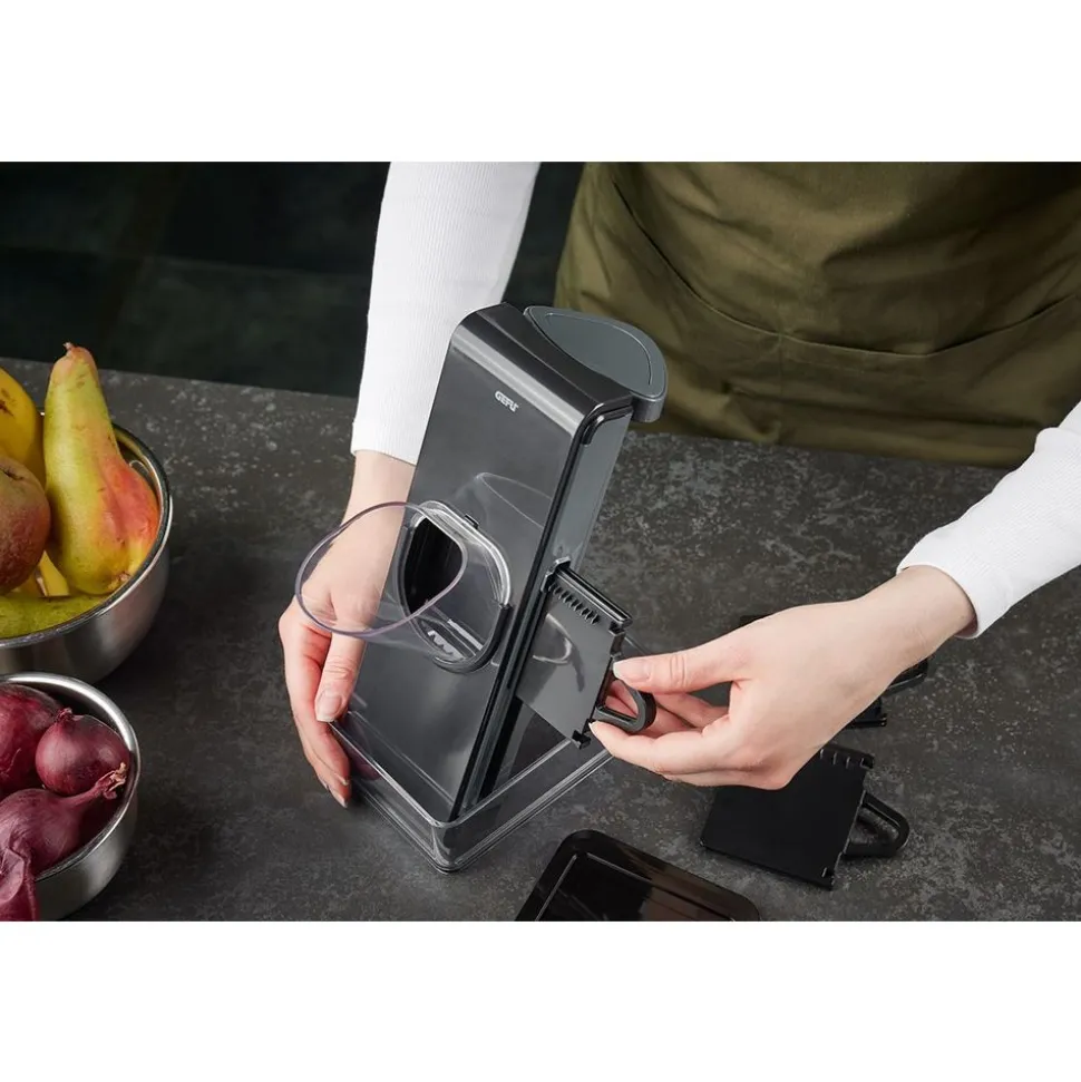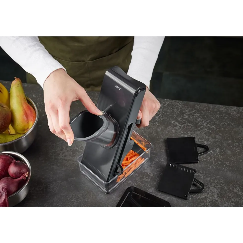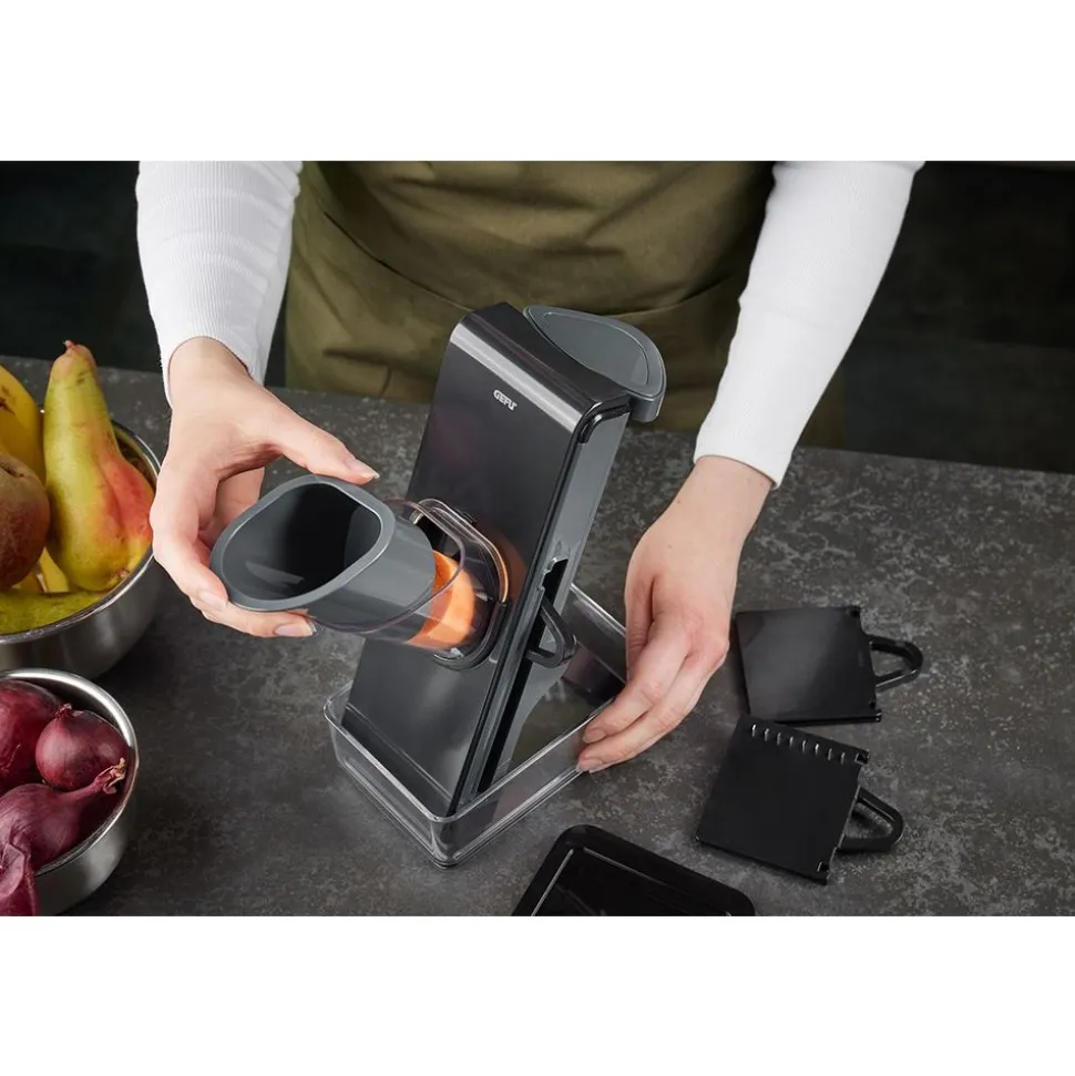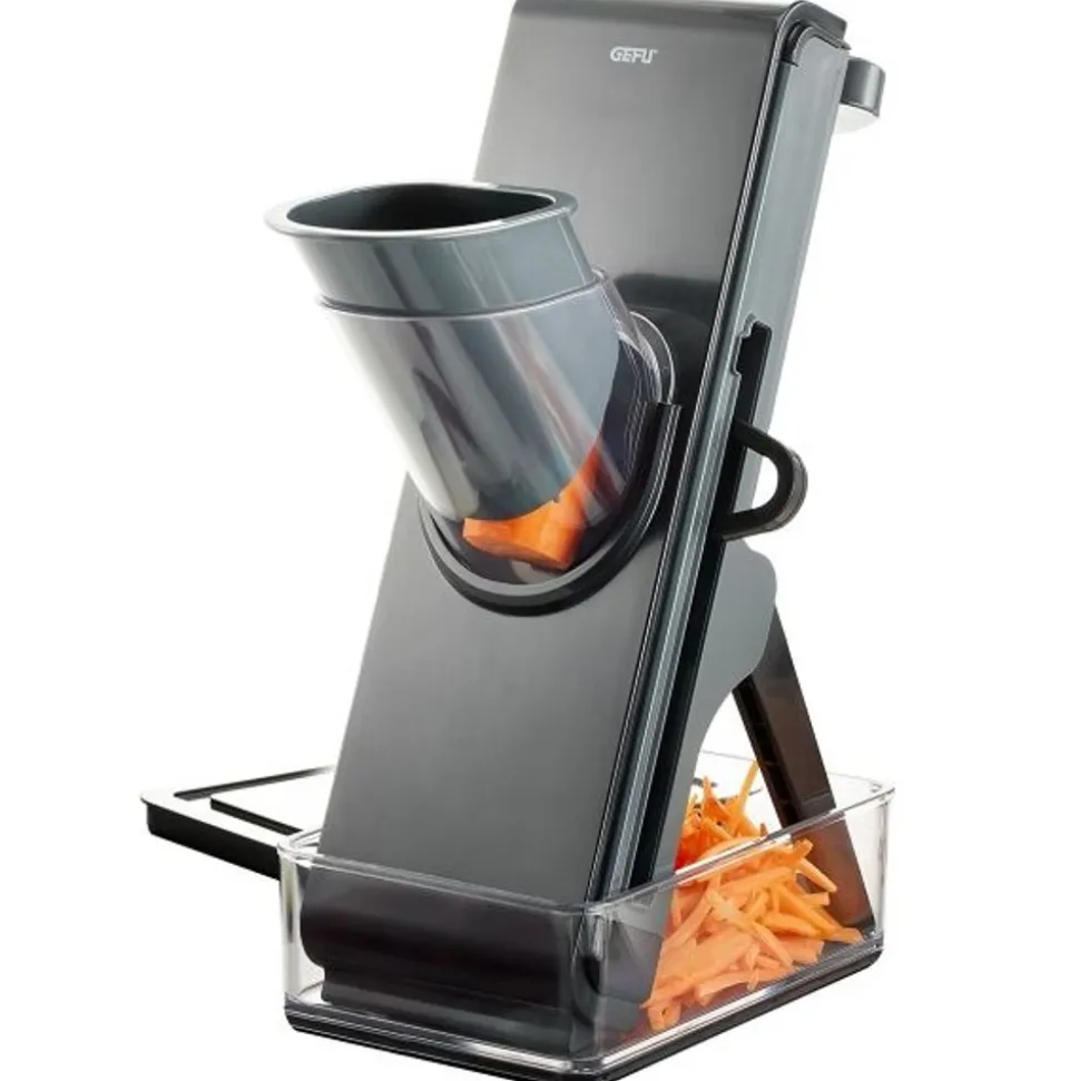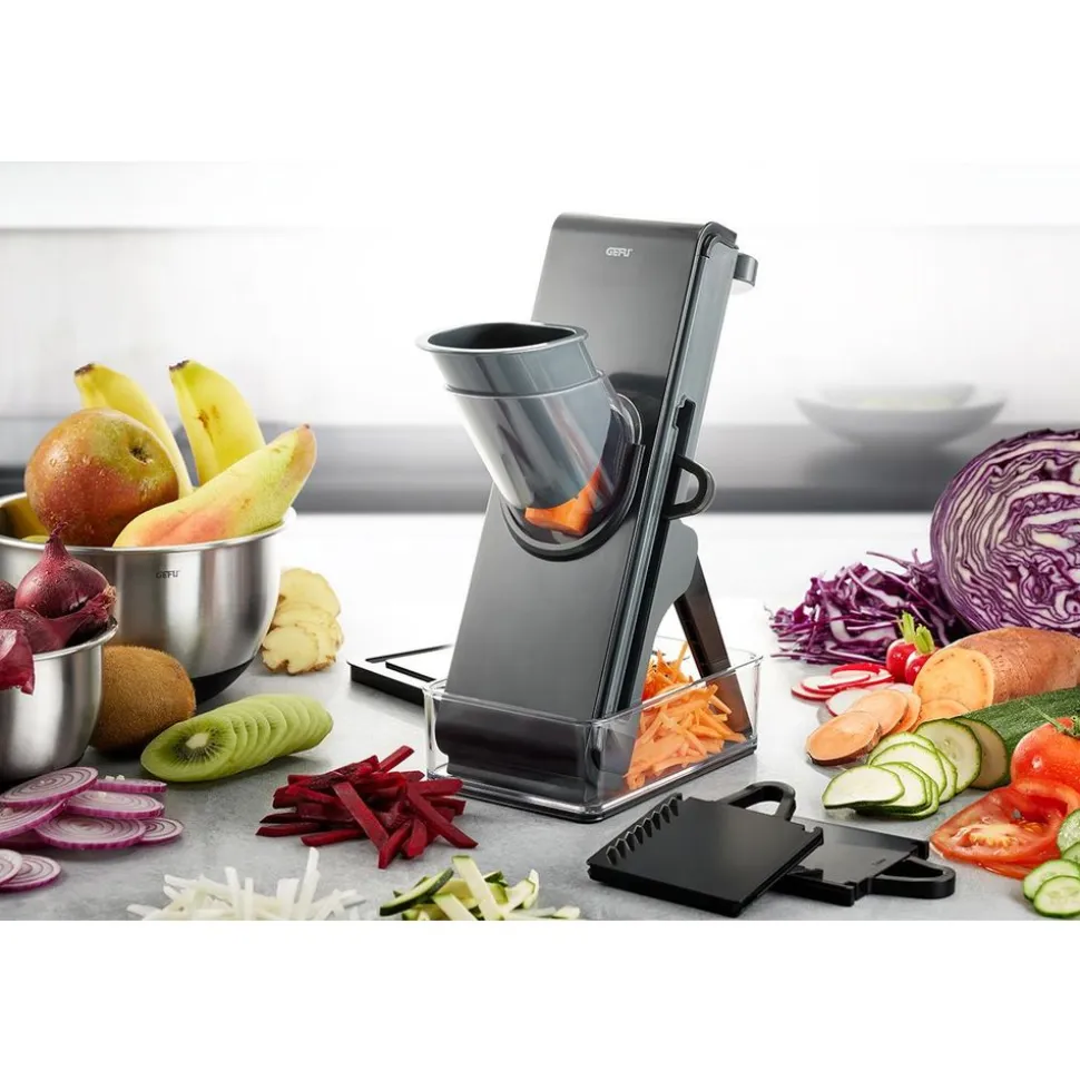 De geniale groentesnijder STANDO is de must-have voor iedereen die groenten en fruit snel en bijzonder veilig wil snijden of hakken – van fijne juliennereepjes tot perfecte plakken. Het hoogtepunt: niet het te snijden materiaal wordt verplaatst, maar de snijeenheid met zijn verwisselbare snijplaten. Hierdoor komen vingers niet in aanraking met de vlijmscherpe messen en is het hakken van aardappelen, zoete aardappelen, courgettes, komkommers, wortelen, gember, knoflook of fruit zoals bananen, appels, peren en kiwi’s altijd kinderspel en super- veilig.
