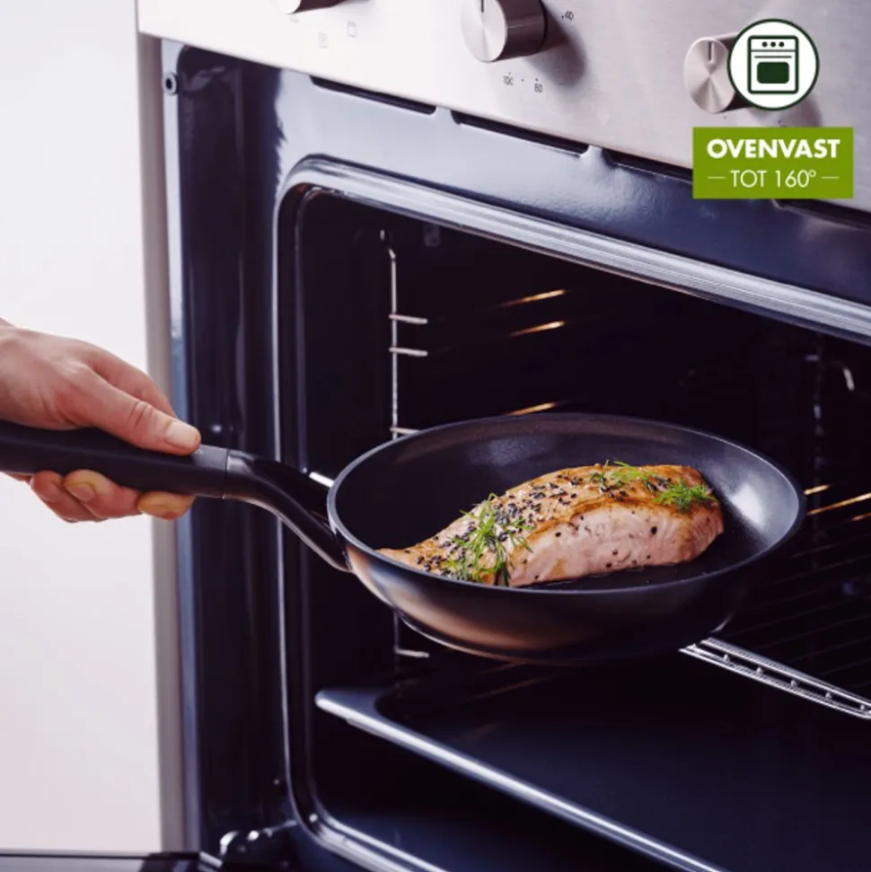 De Smart Collection is stapelbaar zodat je ze netjes en compact kan opbergen. Ze neemt maar liefst 30% minder plaats in in je keukenkast! De pannen hebben een Thermolon Infinity Pro keramische antikleeflaag die versterkt werd met diamant en geen schadelijke stoffen bevat (PFAS-vrij). De koele V-vormige handgreep zorgt ervoor dat je geen pannenlapjes nodig hebt om de pan veilig te verplaatsen en dankzij de naadloze binnenkant wordt afwassen makkelijker dan ooit!