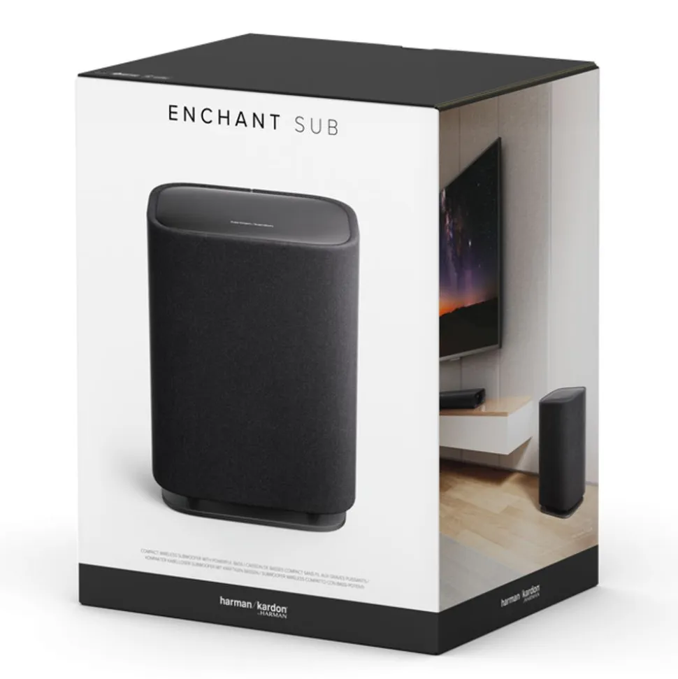 Maak het geweldige geluid van je Enchant soundbar nog spectaculairder. Dat is de magie van de Harmon Kardon Enchant Sub. Sluit de subwoofer draadloos aan op de Enchant 900 of Enchant 1100 en je hoort direct dat de brede, omringende soundstage van de soundbar nog dieper en levensechter worden. De naar beneden gerichte subwoofer van 6,5″ voegt een zuivere, diepe en rijke bas toe, terwijl de nieuw ontworpen basreflector zorgt voor heldere en nauwkeurige lage tonen. Zelfs als je de subwoofer op een vloerkleed neerzet. Het creëert een geluidservaring waarbij je films intenser beleeft. Games worden nog spannender. Muziek nodigt je uit om te gaan dansen. Het slanke, compacte design en het fraaie aluminium bovenpaneel zorgen ervoor dat de ruimtebesparende Enchant Sub in elke kamer past, met elke interieurstijl. De Harman Kardon One-app is eenvoudig in te stellen en kan ook worden gebruikt om de geavanceerde geluidsinstellingen aan te passen. De Enchant Sub tilt je home audio-ervaring naar een hoger niveau.