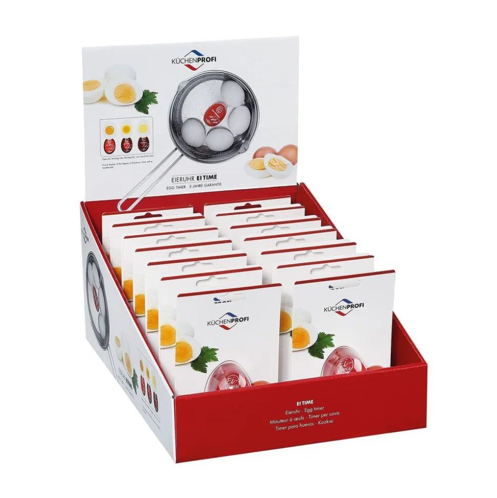 Deze eierklok heeft geen wijzers nodig. Het EI-TIME-model van Küchenprofi is uitgerust met een sensor en een kleurwisselelement. De sensor meet de temperatuur, het kleurwisselelement absorbeert de warmte op dezelfde manier als je ontbijtei. Tijdens het koken verandert de timer van kleur van buiten naar binnen, van lichtrood tot donker kastanje. Op de schaalverdeling lees je de hardheidsgraad af en het perfecte moment om het ei uit de pot te halen. Slim: De klok houdt rekening met hoeveel eieren en hoeveel water je gebruikt. Zo krijgt iedereen aan tafel een staaltje naar eigen smaak bereid.