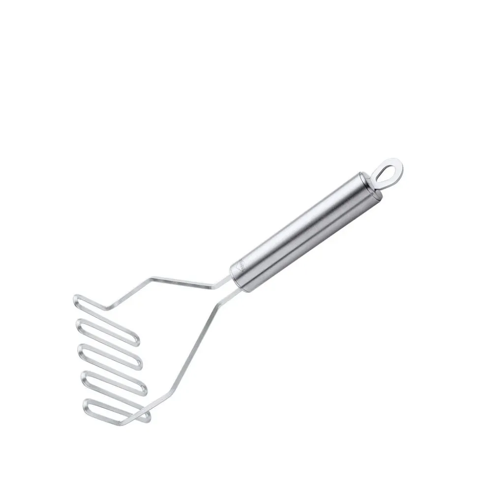 Kant-en-klare puree? Gaat niet eens in de tas! Als u er hetzelfde over denkt, moet u kennis maken met de PROFI-aardappelstamper van KÜCHENPROFI. Hij is gemaakt van roestvrij staal, is stevig vervaardigd en ligt comfortabel in de hand. In plaats van de gebruikelijke perforatie heeft het apparaat een speciaal gevormde, vierkante draad. Hierdoor pureer je de aardappelen zonder enige moeite. Ook de lengte van 29 cm draagt ??bij aan comfortabel werken. Daarna is het schoonmaken van de aardappelstamper snel en eenvoudig. Het kan in de vaatwasser. En als het praktische apparaat weer mooi glanst, hang je hem met het oogje aan de keukenrail aan de muur.