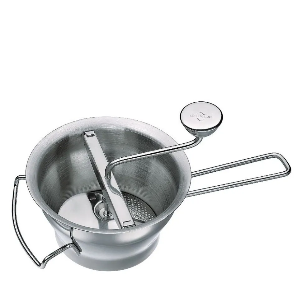 Het resultaat is de perfecte combinatie van functie en design. Het apparaat van massief roestvrij staal ligt comfortabel in de hand, de slinger met de grote knop kan gemakkelijk worden gedraaid. Met drie zeefschijven en een raspschijf voor het zeven van voedsel met een harde schil, zoals appels of tomaten, blijft er niets te wensen over. Tomatensoep, appelmoes, aardappelpuree of fruitgelei komen vers op tafel.