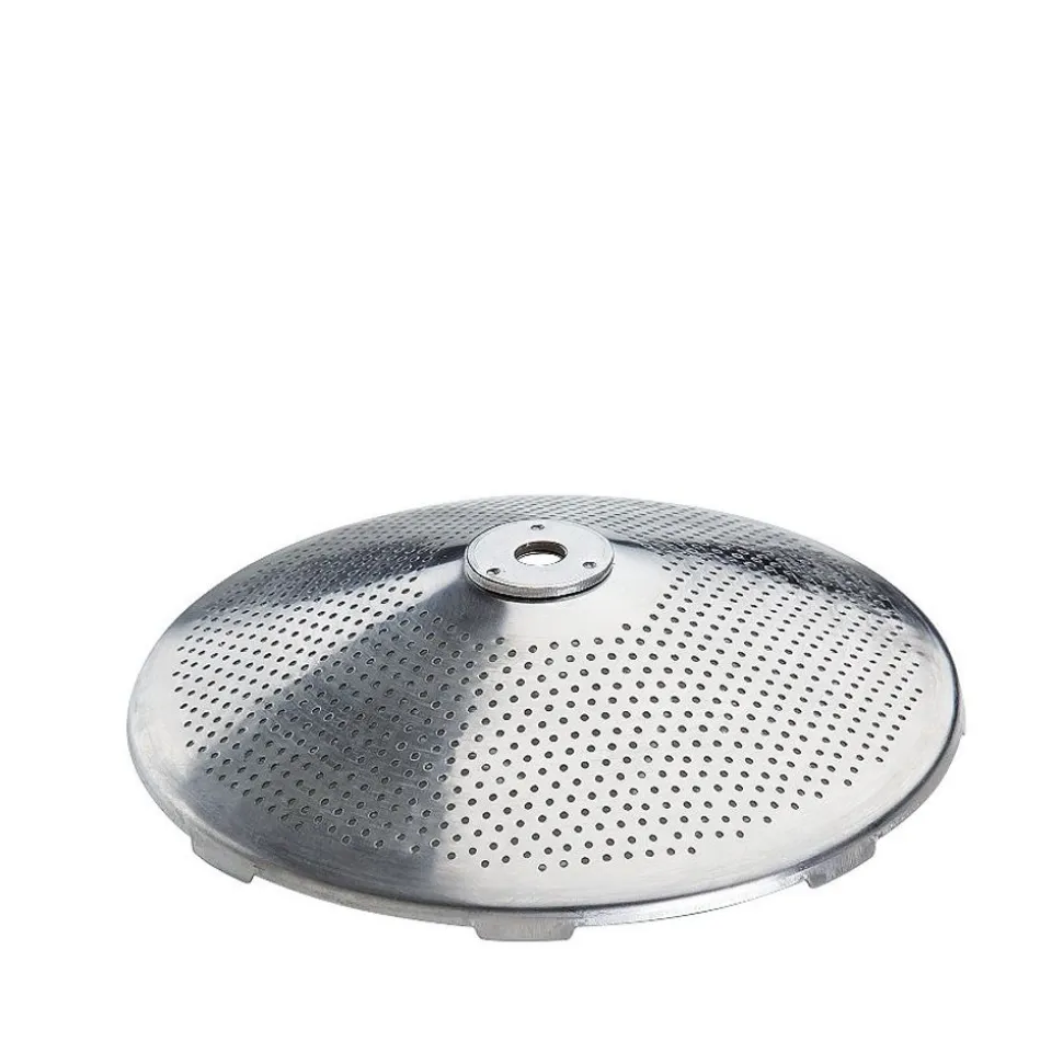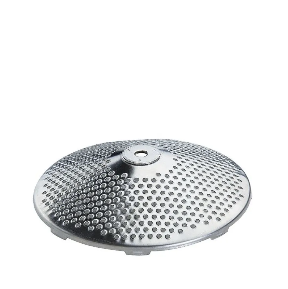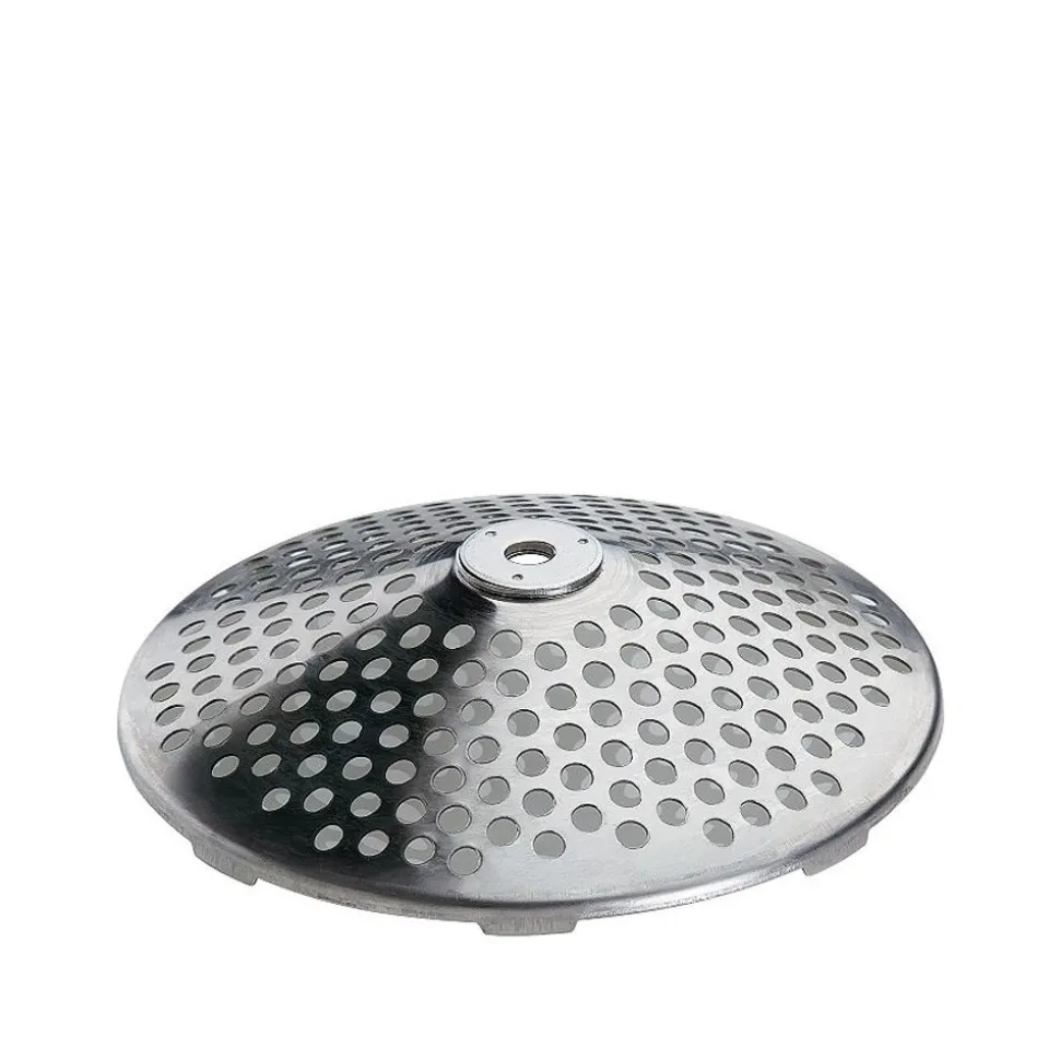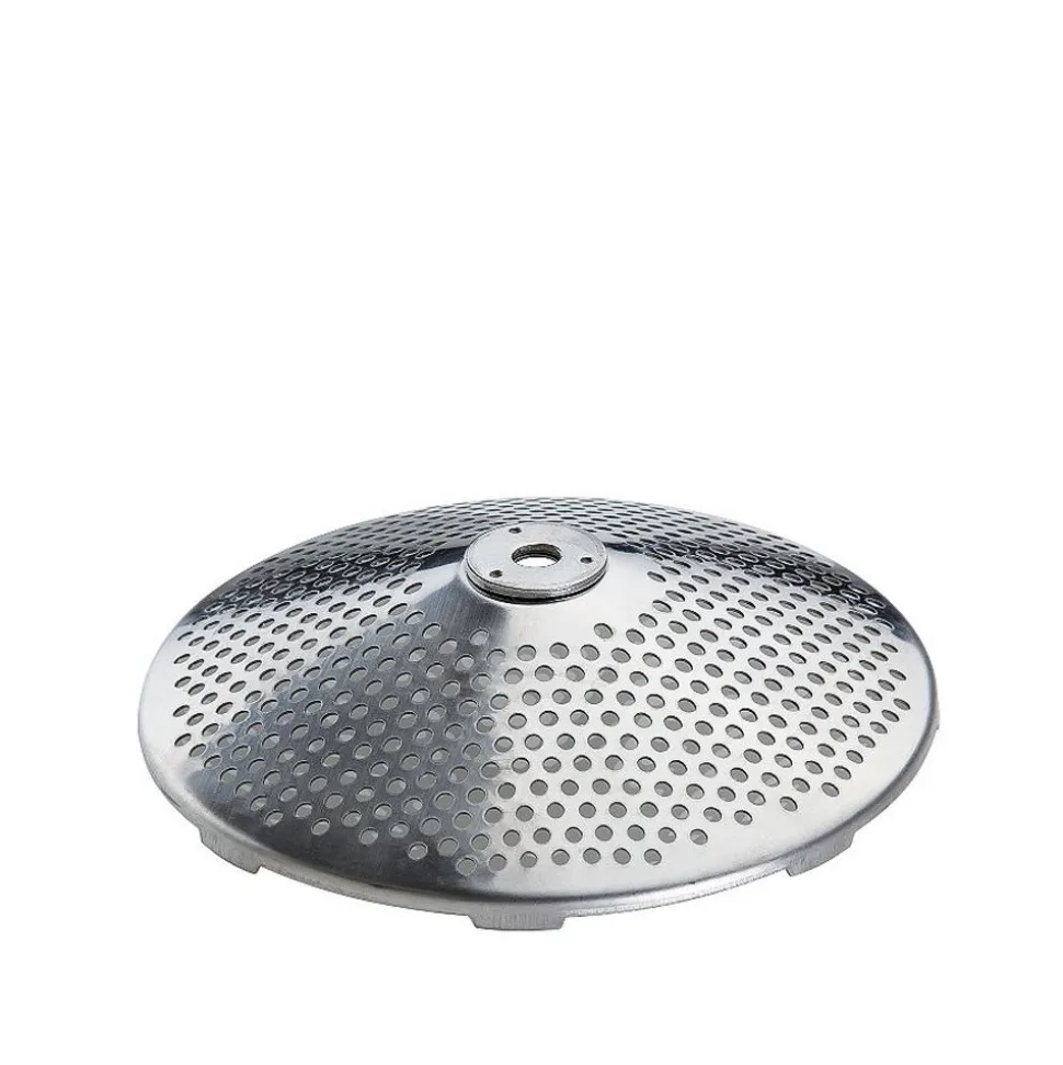 Met vier RVS schijven (grof 5 mm, medium 3 mm, fijn 2,5 mm en extra fijn 1,3 mm),