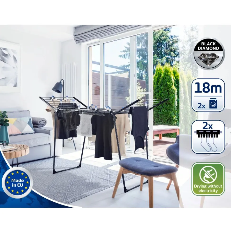 Een combinatie van bewezen kwaliteit, stabiliteit en een trendy design: dat kenmerkt het Leifheit wasrek in zwart-antraciet uit de „Black Diamond-serie“. Het stijlvolle Pegasus 180 Solid Black wasdroogrek in effen zwart heeft alle eigenschappen die een verplaatsbaar staand wasrek nodig heeft. Met de parallelle poten kan het wasrekje van Leifheit binnenshuis, op het balkon of in de buitenlucht stabiel worden neergezet. Bovendien heeft de Pegasus 180 een grote drooglengte van 18 meter waardoor er voldoende ruimte is voor het ophangen van ongeveer twee wasmachineladingen. Waar hij ook staat: het zwarte droogrek blijft een stijlvolle blikvanger. De lengte van de lijnen is heel geschikt voor stukken wasgoed met grote afmetingen zoals badhanddoeken, beddengoed of broeken. De zijdelings uitklapbare vleugels hebben een hoogte van 105 cm, waardoor het wasgoed de grond niet meer raakt. Daarnaast beschikt het moderne zwarte droogrek van Leifheit ook over twee houders voor kleine onderdelen om snel sokken of vaatdoeken zonder wasknijpers op te kunnen hangen. Door de inklapbare poten en zijvleugels kan de Pegasus 180 Solid Black na het drogen weer makkelijk worden ingeklapt. De speciale poedercoating in zwart-antraciet zorgt voor een duurzame bescherming tegen roest.