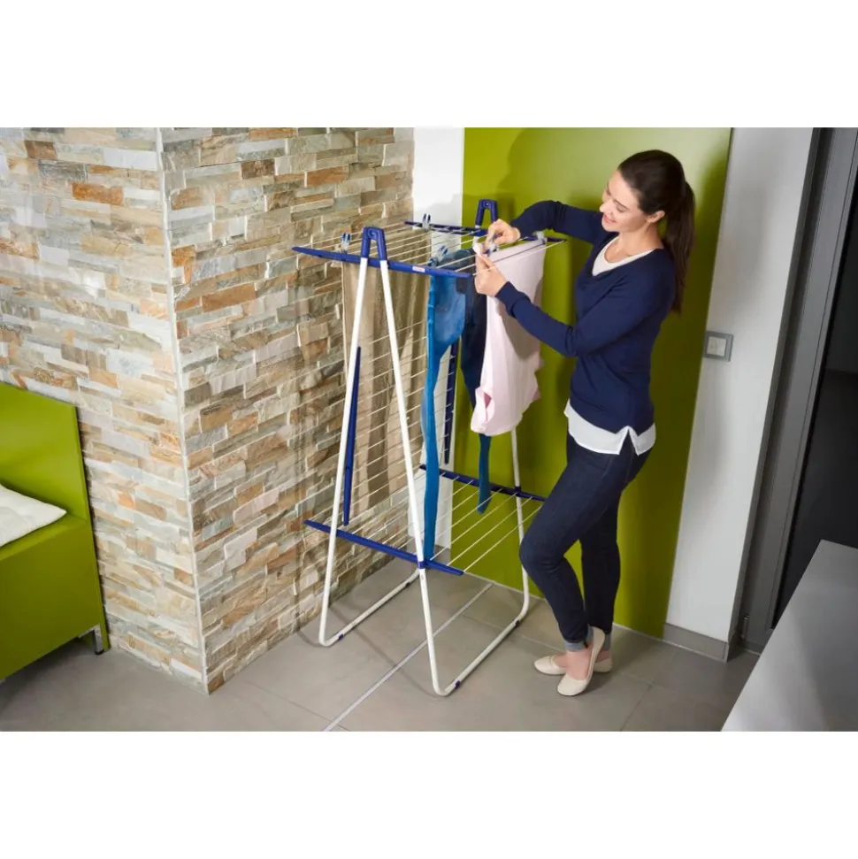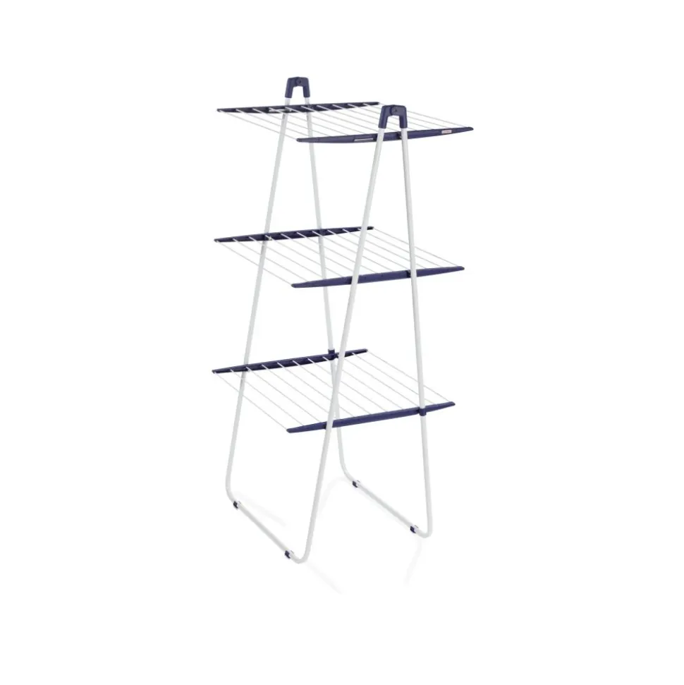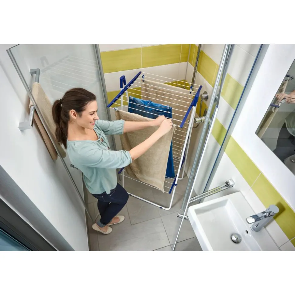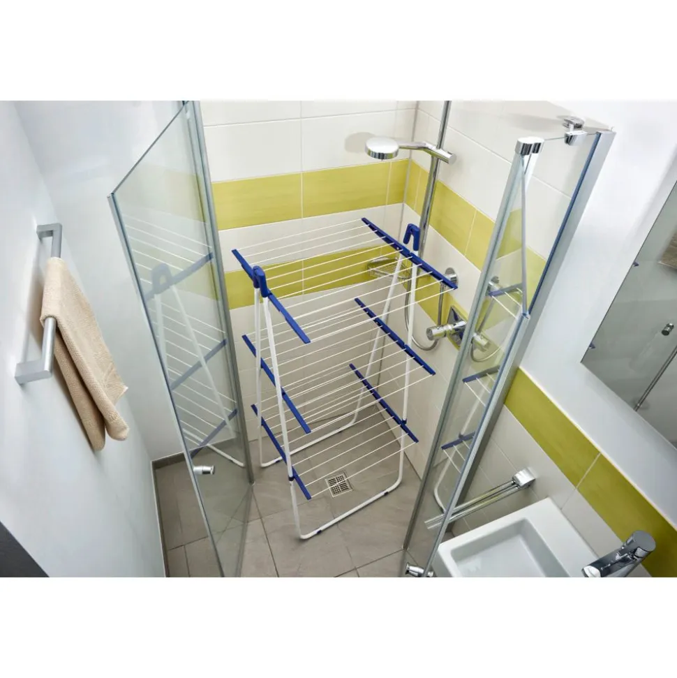 Wie de droogtoren Pegasus Tower 190 van Leifheit koopt, krijgt veel ruimte voor al het wasgoed op een plaatsbesparend en stevig droogrek. Dankzij de kleine oppervlakte van slechts 66 cm x 61 cm past de hoge droogtoren probleemloos in de douche en/of elke hoek in huis. De drie droog-verdiepingen bieden een drooglengte tot wel 19 meter. Hierdoor is er genoeg ruimte voor twee hele wasmachineladingen op de Leifheit droogtoren. De middelste verdieping is inklapbaar, om zo het moeiteloos drogen van lange stukken wasgoed mogelijk te kunnen maken. Het Leifheit droogrek is daarnaast een stabiel en roestbestendig droogrek. Hierdoor is het wasrek ideaal voor het drogen van de was in de badkamer of op het balkon. Wanneer de Leifheit Pegasus Tower 190 droogtoren niet in gebruik is, kan deze simpelweg worden ingeklapt en verplaatst. Zo kan deze plaatsbesparend worden opgeborgen – bijvoorbeeld tussen een kast en de muur.