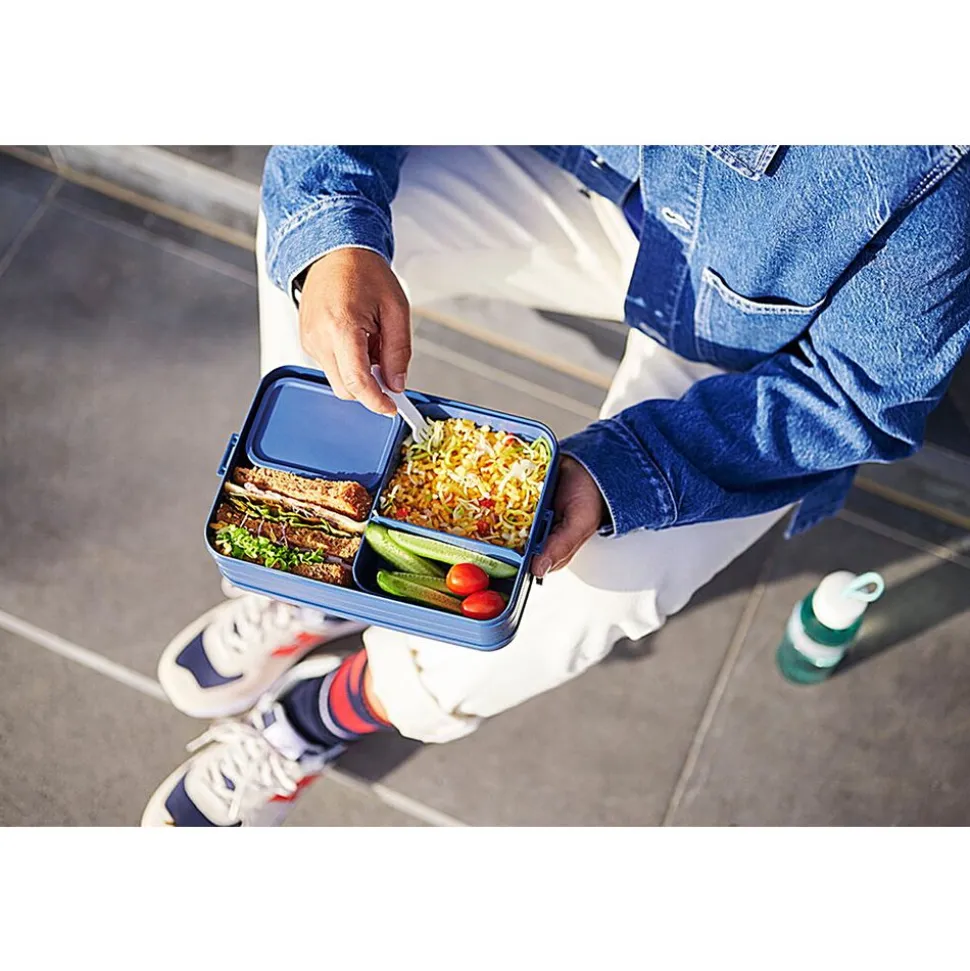 Bento lunchbox Take a Break large in de kleur Nordic sage, inclusief bento boxjes. Nog restjes over van gisteren? Neem ze gerust mee onderweg. Met twee aparte vakken, plus een extra box met vorkje, houdt de Bento in jouw lunchbox je (hartige) lunch altijd heerlijk vers! Combineer er op los, en bepaal zelf wat je eet en wanneer. De lunchbox met Bento is robuust en herkenbaar eigenwijs van vorm. De bentobakjes in de lunchbox mogen (zonder deksel) in de magnetron. Perfect voor het combineren van verschillende kleine gerechtjes. Dus geniet met volle teugen!