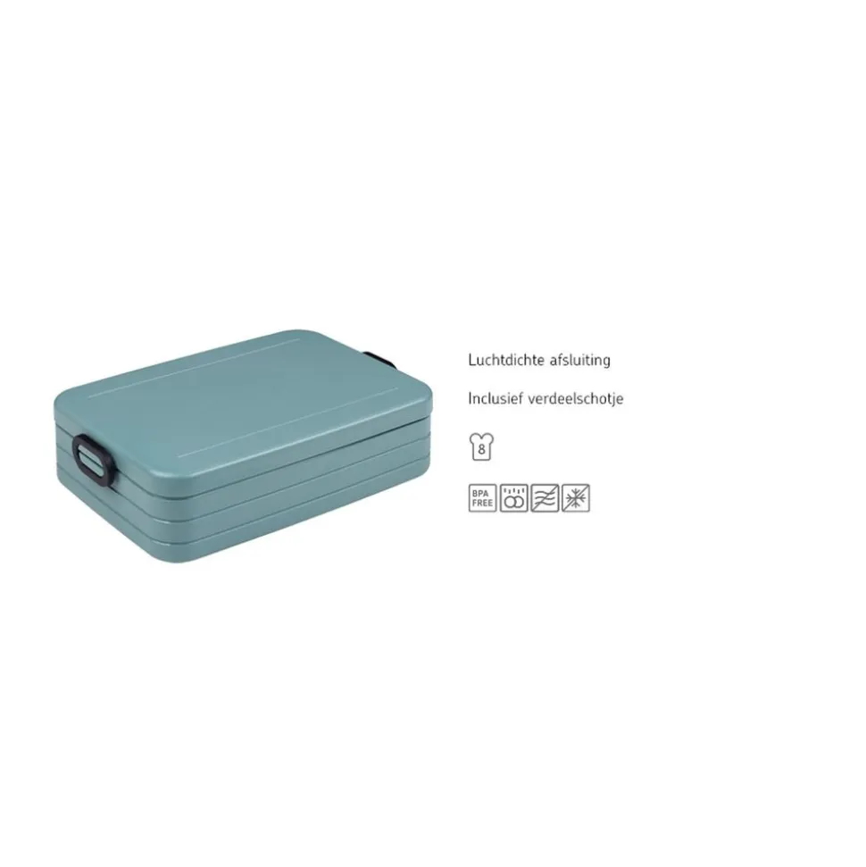 Lunchbox Take a Break large in de kleur Nordic blue. Deze grote blauwe broodtrommel van Mepal is geschikt voor maximaal 8 boterhammen. Hij is voorzien van een afdichtring die de inhoud altijd lekker vers houdt en een divider, waarmee etenswaren eenvoudig van elkaar kunnen worden gescheiden. Neem vanaf nu dus uw eigen lunch mee in deze broodtrommel. Dat is niet alleen goedkoop, maar ook lekker en gezond!