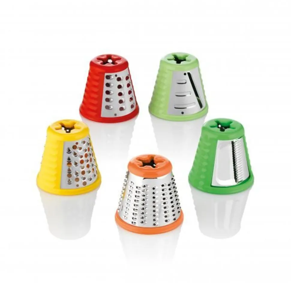 5 kegels = 5 kleuren = 5 functies: fijn raspen, grof raspen, fijn snijden, afkrabben