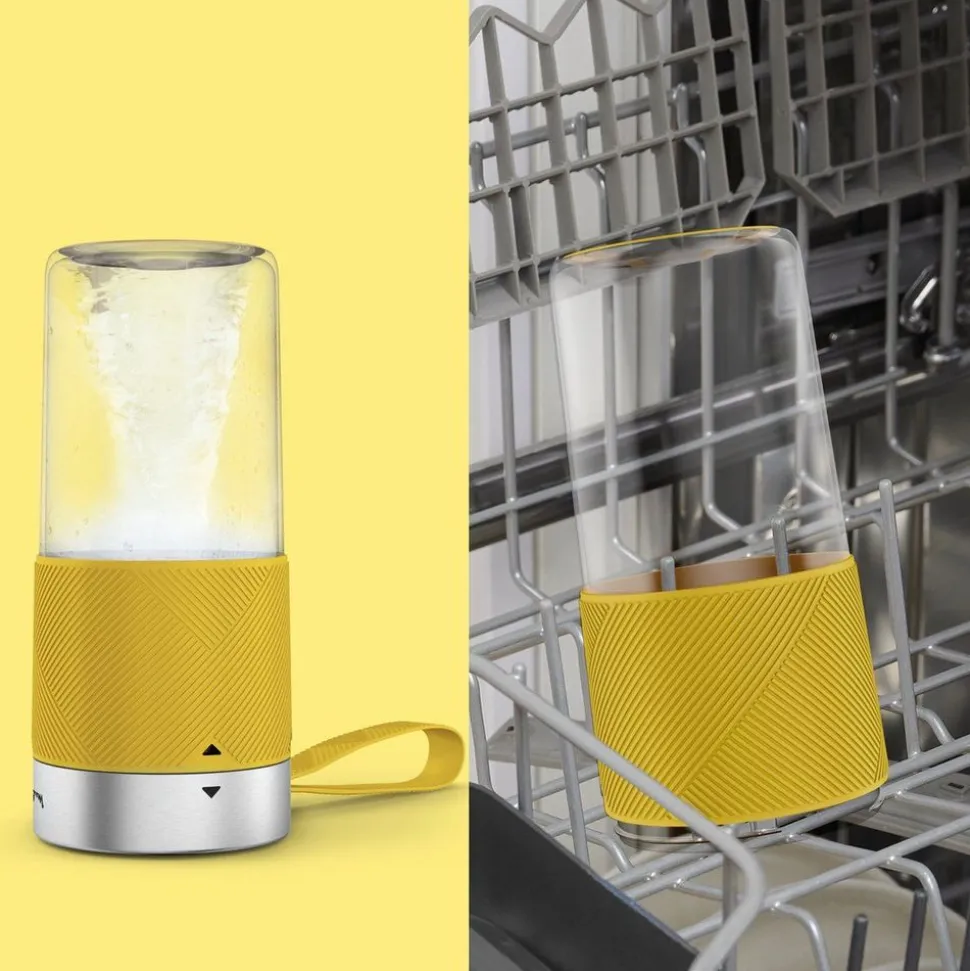 Geniet van een lichtgewicht, compacte en draagbare blender met een zacht siliconen handvat en een inhoud van 300 ml. Perfect om te mixen en te drinken, of je nu in het park, de sportschool of onderweg bent.