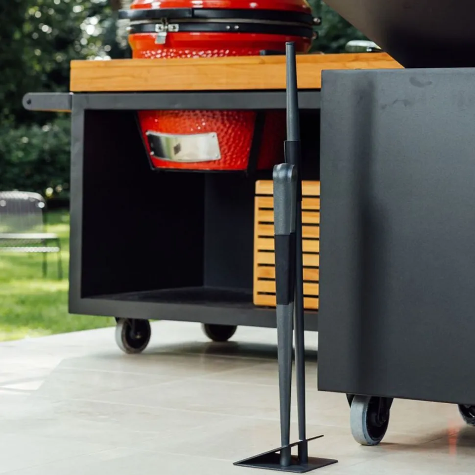 De Buffadoo set bestaat uit een prachtig gemaakte blaaspijp en stoere tang/pook met bijpassende voet. De blaaspijp heeft een leren greep en een siliconen mondstuk en wordt gebruikt om zuurstof in de OFYR kookunit te blazen waardoor er bij het aanmaken van het vuur sneller vlammen ontstaan en rook vermeden kan worden. Met de tang/pook kan gemakkelijk nieuw hout aan het vuur worden toegevoegd wanneer dit reeds goed brandt. Verkrijgbaar in bruin en zwart gecoat staal met bruine en zwarte leren grepen.