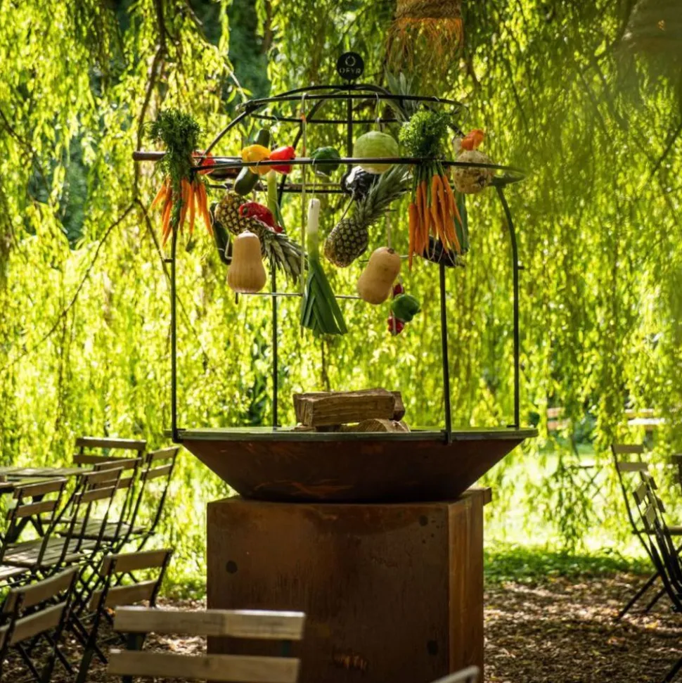 De OFYR Cage is het perfecte accessoire voor de professionele chef die van showcooking houdt. Dankzij de koepelvormige structuur kan het voedsel aan de stalen bogen worden opgehangen, waardoor een uniek en interactief visueel element ontstaat. De hitte van het vuur kookt de ingrediƫnten langzaam gaar, van vlees en vis tot fruit en groenten. Doordat de Cage aan de buitenrand van de plaat wordt bevestigd, blijft het kookoppervlak vrij om andere gerechten te bereiden. Ingrediƫnten kunnen in de Cage worden opgehangen met spiesen en S-haken.