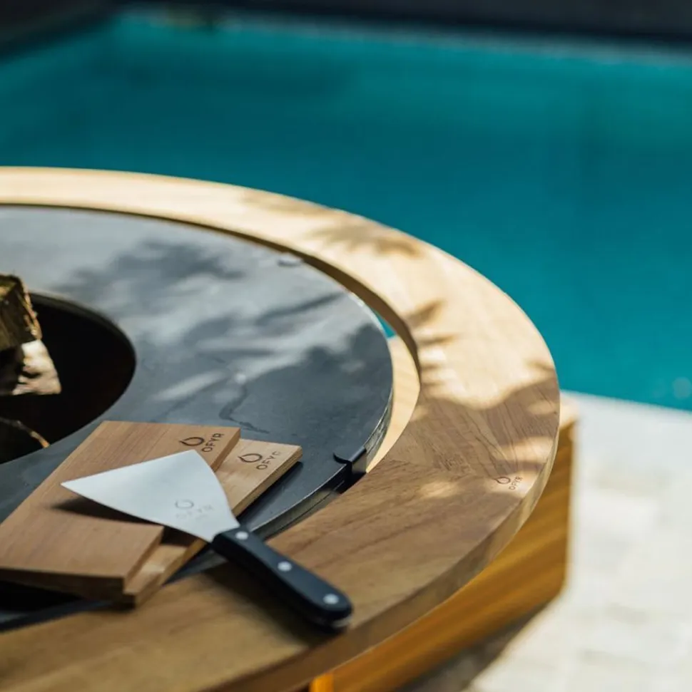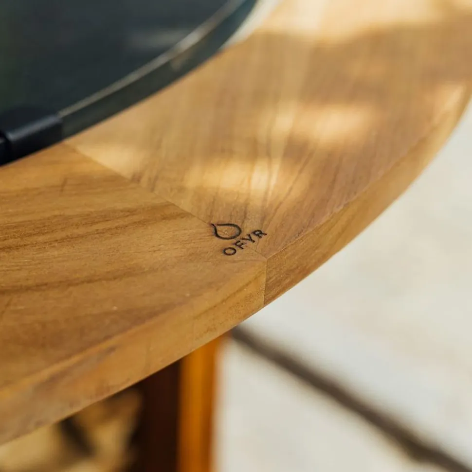 De fraaie Fire Guard Ring voorkomt dat de hete kookplaat van de OFYR per ongeluk wordt aangeraakt. Daarnaast kan de 12,5 cm brede rubberwood ring dienen als tafel voor kleine gerechten. De Fire Guard Ring is gemakkelijk op de plaat te monteren met behulp van zes stalen klemmen. Na gebruik dient u de Fire Guard Ring binnenshuis op te bergen.