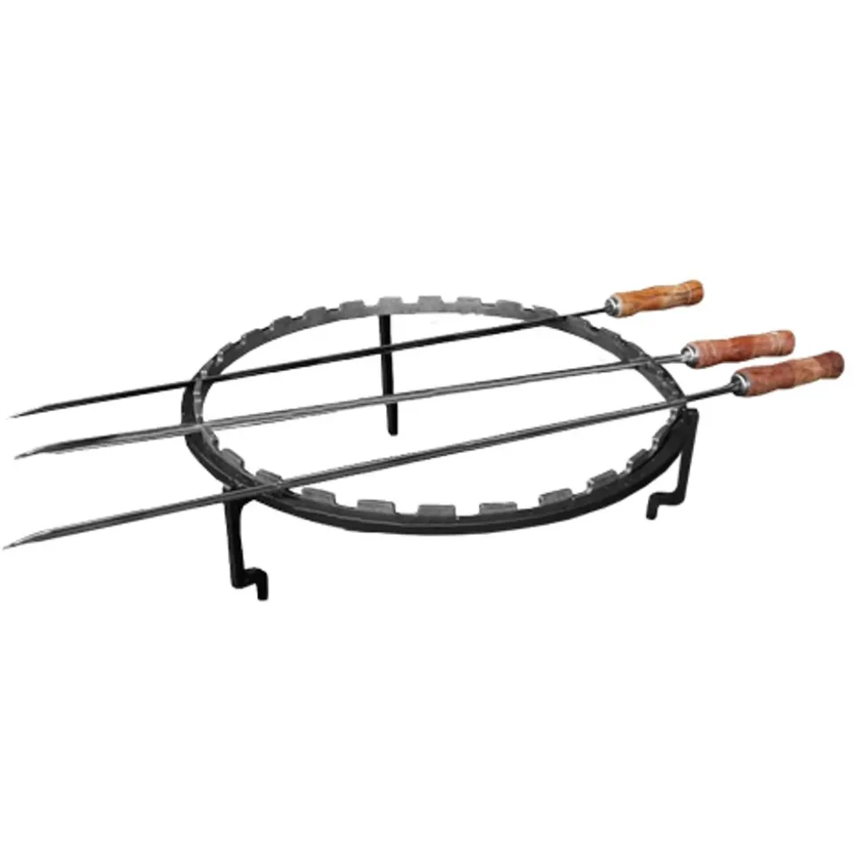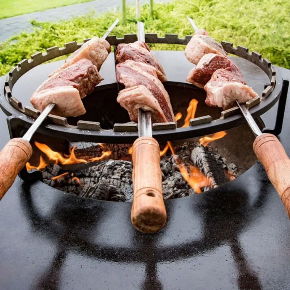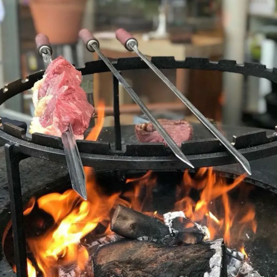 Het ‘brochetteset ‘ bestaat uit een verhoogde ring en 3 spiesen met houten handvat, om het vlees op te rijgen of te spiezen. Om het vlees te grillen boven de OFYR vuurhaard dia 100.