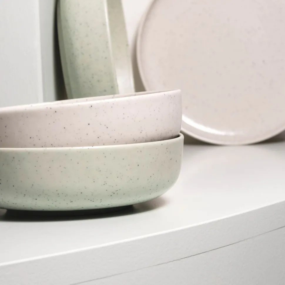 Hou je van een minimalistische uitstraling op je eettafel? Dan is onze DOT-collectie iets voor jou! Deze collectie bestaat uit borden, kommen en mokken, verkrijgbaar in stijlvol beige en levendig groen, elk met een subtiele, trendy spikkel. Bovendien is de collectie gemaakt van porselein, wat stevigheid garandeert!