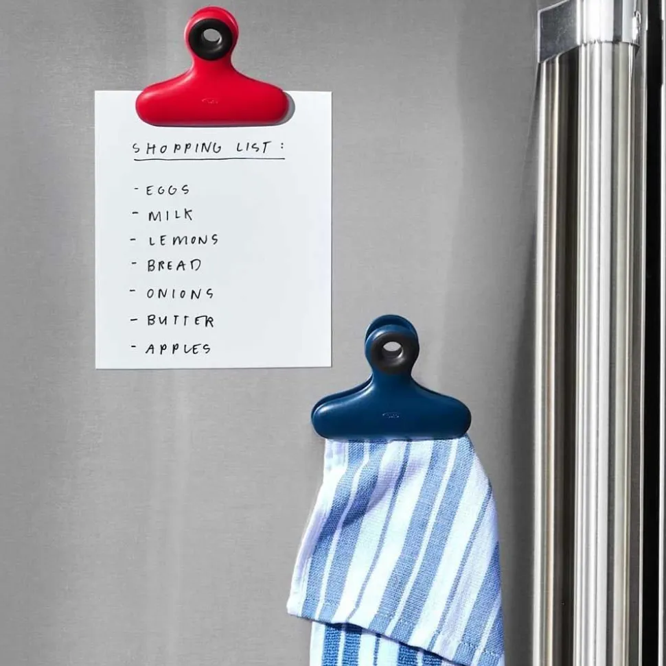De clips zijn voorzien van een handige magneet, waardoor je de OXO Zaksluiter ook op de koelkast of op een magneetbord kunt hangen om briefjes tussen te knijpen.
