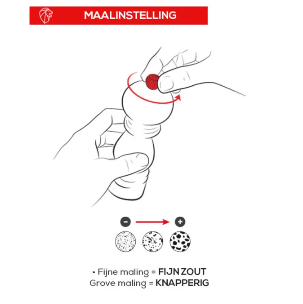 – Zoutmolen: voor het malen van droog grof zout van max. 6 mm. Niet gebruiken voor vochtig zeezout, zelfs als het gedroogd is.