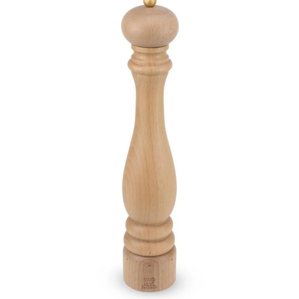 De zoutmolen Paris u’Select, een uitzonderlijk model, volledig uit beukenhout, maakt indruk met zijn grootte van 40 centimeter en met zijn gladde lijnen. Zijn groot reservoir bewaart de droge zoutkristallen die op het laatste moment worden gemalen door het Peugeot-maalwerk met onbeperkte garantie. De goudkleurige knop gegraveerd met de kop van de leeuw van Peugeot, op de kop van deze houten molen, geeft hem een bijzonder elegante uitstraling. De manuele zoutmolen Paris u’Select is uitgerust met een innovatief systeem voor een instelbare maalgraad. Aan tafel of in de keuken, de molen Paris wordt een onmisbaar dagelijks instrument.