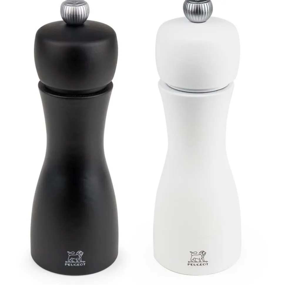 Dit duo peper- en zoutmolen Tahiti in wit en zwart, volledig in contrast, is herkenbaar aan zijn mooie ranke rondingen. Dit duo molens van 15 cm, volledig uit hout, herbergt het Peugeot-maalwerk met onbeperkte garantie. De knop die de molens versiert, laat u toe om de maalgraad naar uw wens in te stellen: hoe vaster hij aangedraaid is, hoe fijner de maalgraad. De klassieke tinten passen perfect bij uw mooiste hedendaagse tafels.