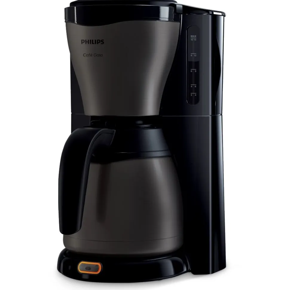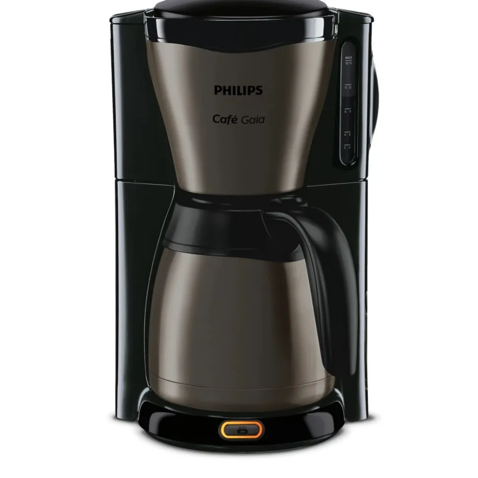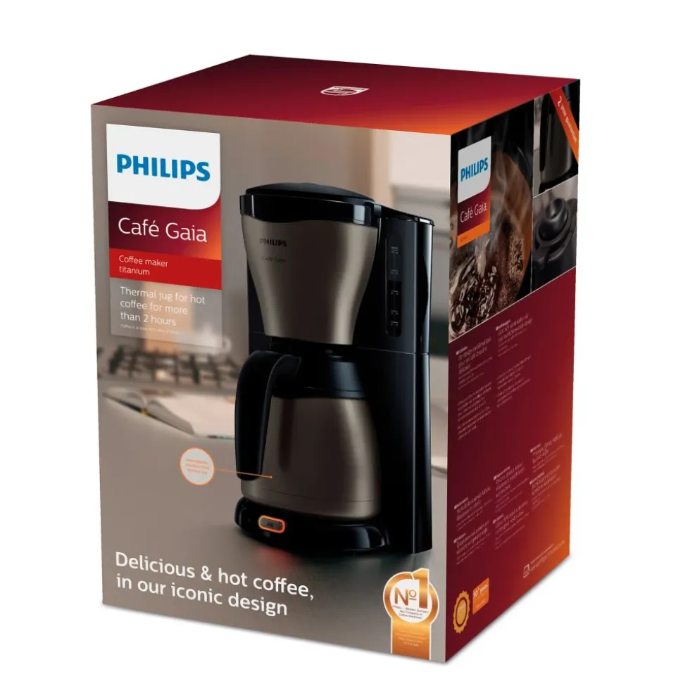 Het Café Gaia-koffiezetapparaat zet koffie van uitstekende kwaliteit. De thermische kan houdt het volledige aroma en de temperatuur van de koffie ruim 2 uur vast. Dankzij het titanium design is dit een hoogwaardig en stijlvol koffiezetapparaat.