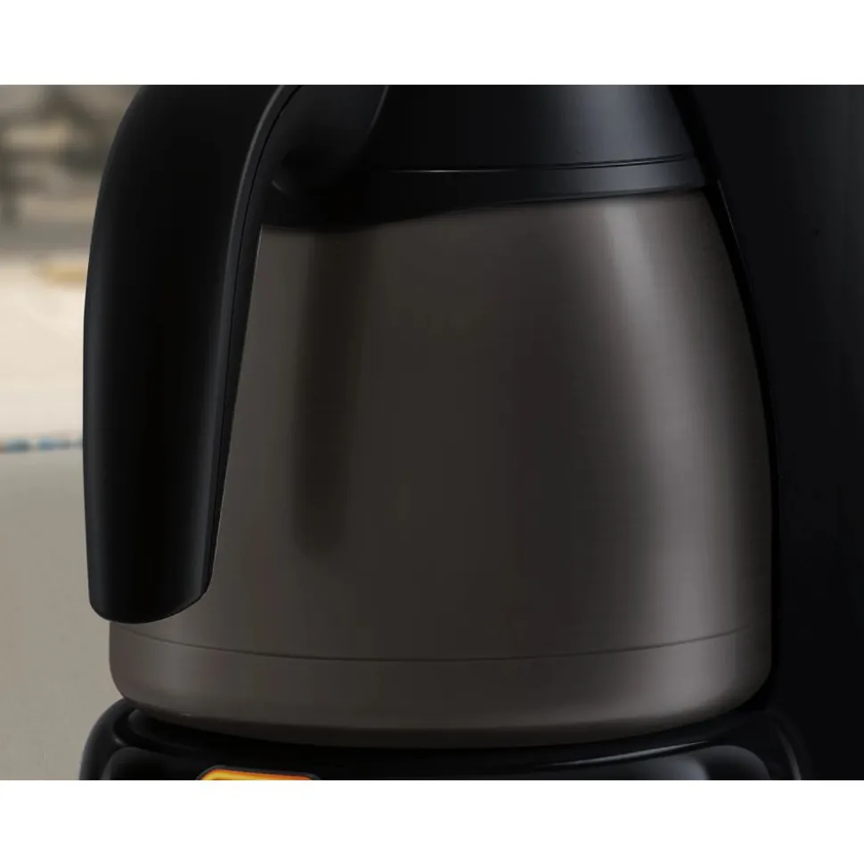 De luxe, onbreekbare roestvrijstalen thermische kan houdt het volle aroma en de temperatuur meer dan 2 uur vast. Dankzij het dubbelwandige ontwerp is de koffie na 2 uur nog minstens 65 °C.